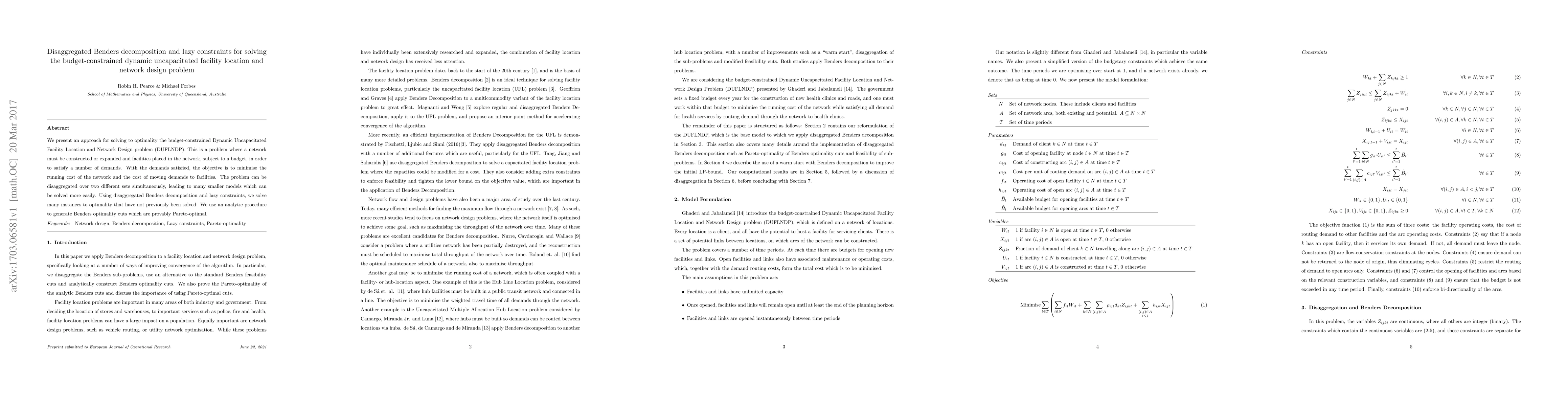 This paper proposes a disaggregated Benders decomposition method with lazy constraints to solve the budget-constrained Dynamic Uncapacitated Facility Location and Network Design problem optimally. The approach breaks the problem into smaller models, generating Pareto-optimal Benders cuts to efficiently solve instances previously intractable.