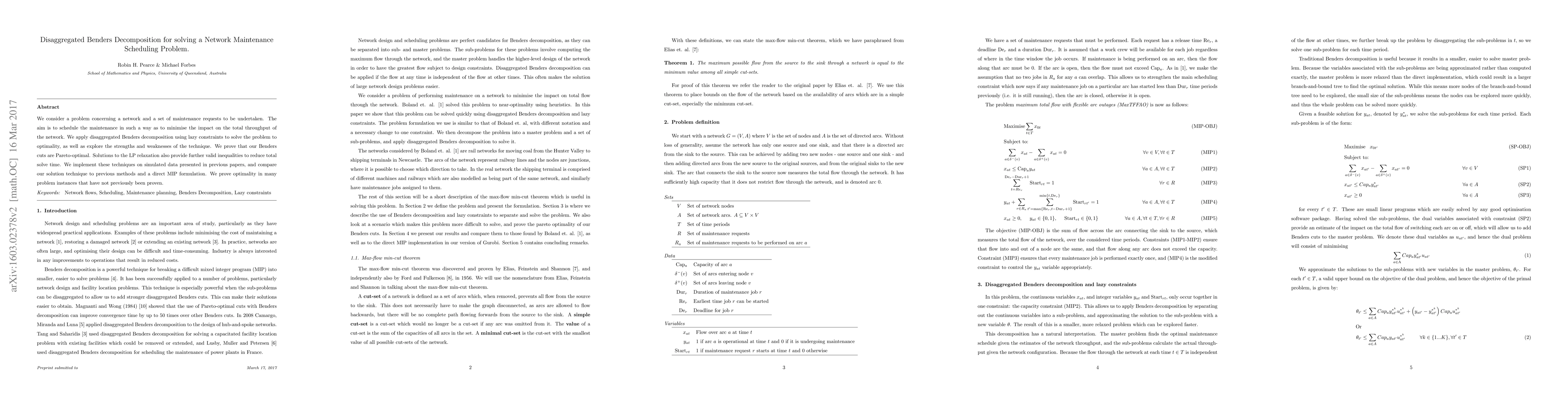 This paper applies Disaggregated Benders cuts and lazy constraints to solve a network maintenance scheduling problem, achieving optimality while reducing solution time, and proving the Pareto optimality of their approach.