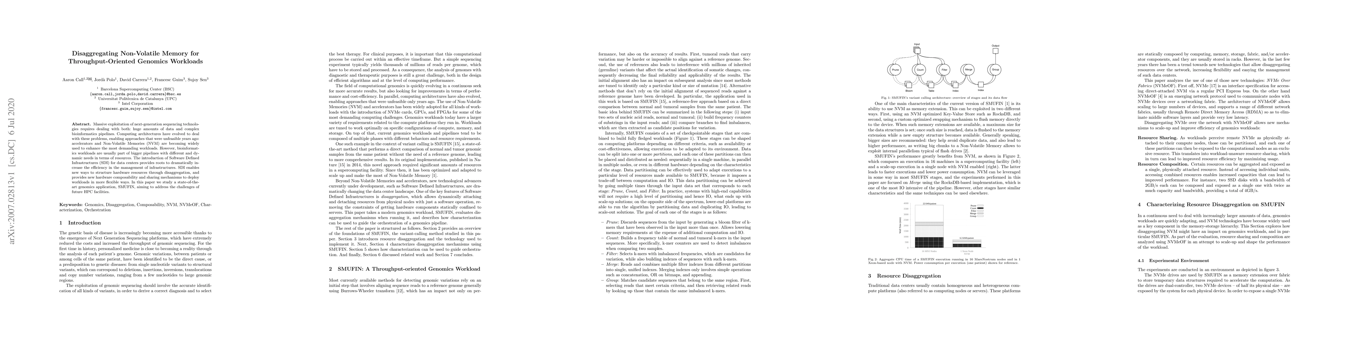 This paper explores the use of disaggregated Non-Volatile Memory (NVM) and accelerators to enhance throughput in genomics workloads, leveraging Software Defined Infrastructures (SDI) to optimize resource management and improve the efficiency of bioinformatics pipelines. The study focuses on the SMUFIN genomics application to address the challenges of future high-performance computing (HPC) environments.