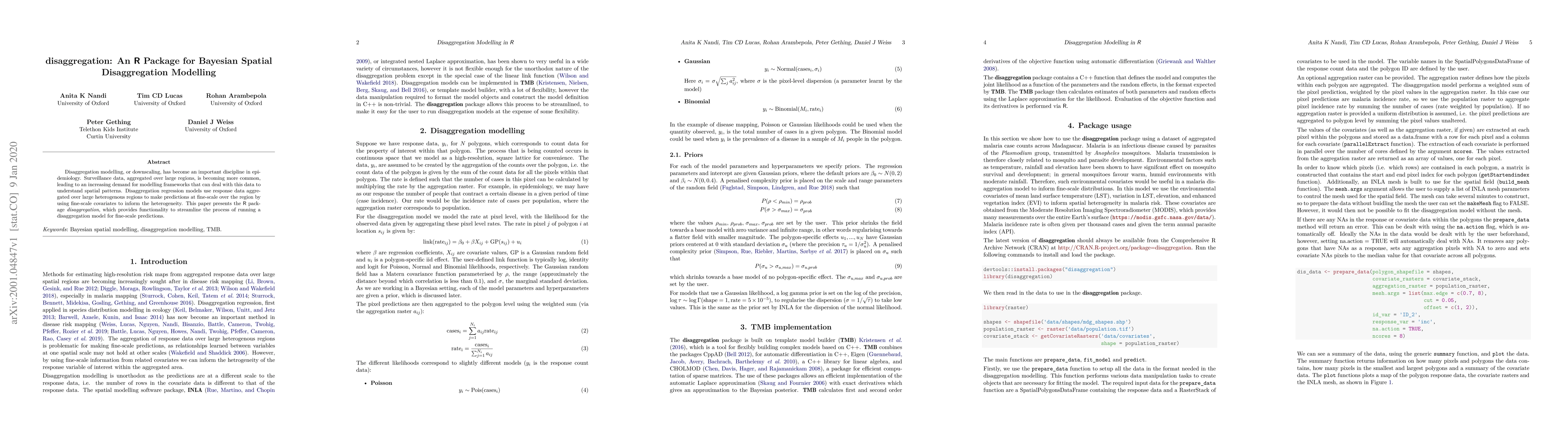 The R package disaggregation facilitates Bayesian spatial disaggregation modelling to downscale aggregated epidemiological data, enabling fine-scale predictions using fine-scale covariates. This tool addresses the growing need for frameworks to understand spatial patterns in surveillance data.