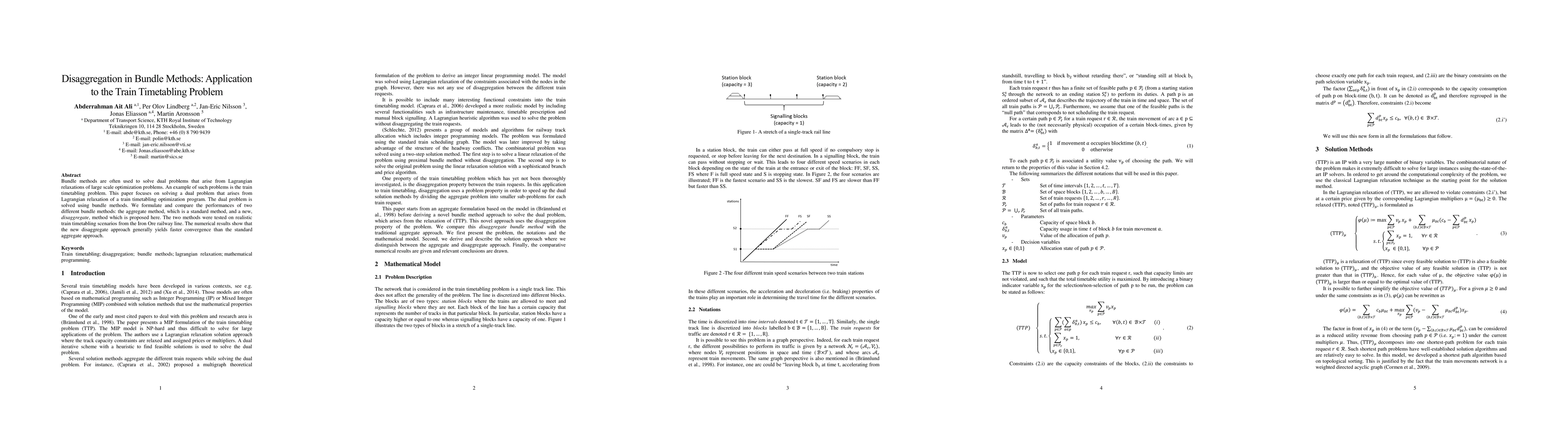 This paper compares two bundle methods for solving the dual problem in train timetabling optimization, finding that the newly proposed disaggregate method converges faster than the standard aggregate method, as demonstrated through realistic scenarios from the Iron Ore railway line.