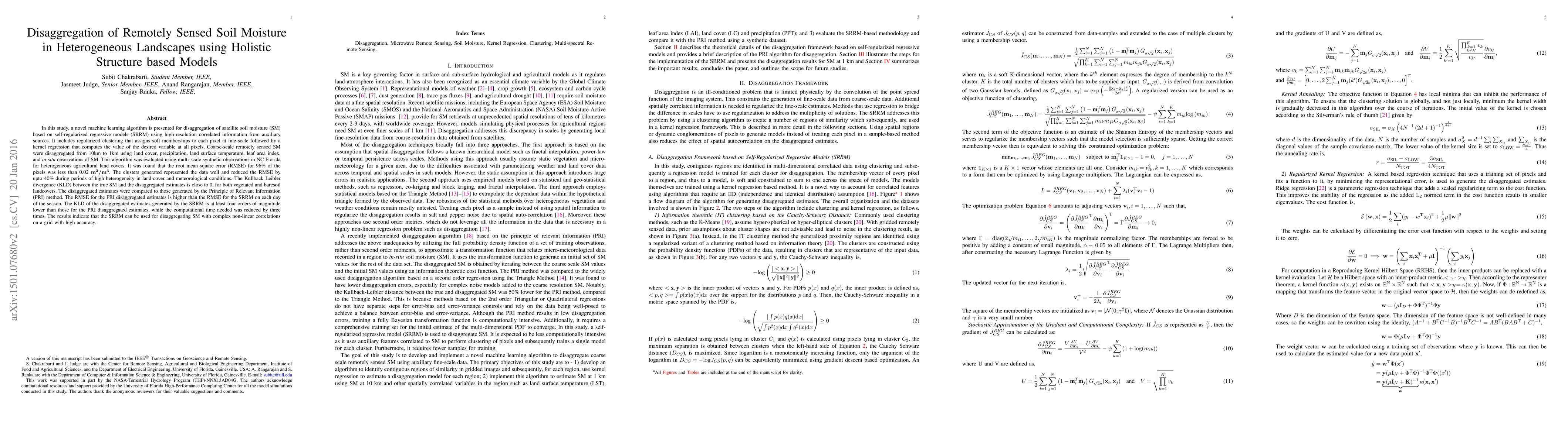 In this study, a novel machine learning algorithm is presented for disaggregation of satellite soil moisture (SM) based on self-regularized regressive models (SRRM) using high-resolution correlated information from auxiliary sources. It includes regularized clustering that assigns soft memberships to each pixel at fine-scale followed by a kernel regression that computes the value of the desired variable at all pixels. Coarse-scale remotely sensed SM were disaggregated from 10km to 1km using land cover, precipitation, land surface temperature, leaf area index, and in-situ observations of SM. This algorithm was evaluated using multi-scale synthetic observations in NC Florida for heterogeneous agricultural land covers. It was found that the root mean square error (RMSE) for 96% of the pixels was less than 0.02 $m^3/m^3$. The clusters generated represented the data well and reduced the RMSE by upto 40% during periods of high heterogeneity in land-cover and meteorological conditions. The Kullback Leibler divergence (KLD) between the true SM and the disaggregated estimates is close to 0, for both vegetated and baresoil landcovers. The disaggregated estimates were compared to those generated by the Principle of Relevant Information (PRI) method. The RMSE for the PRI disaggregated estimates is higher than the RMSE for the SRRM on each day of the season. The KLD of the disaggregated estimates generated by the SRRM is at least four orders of magnitude lower than those for the PRI disaggregated estimates, while the computational time needed was reduced by three times. The results indicate that the SRRM can be used for disaggregating SM with complex non-linear correlations on a grid with high accuracy.