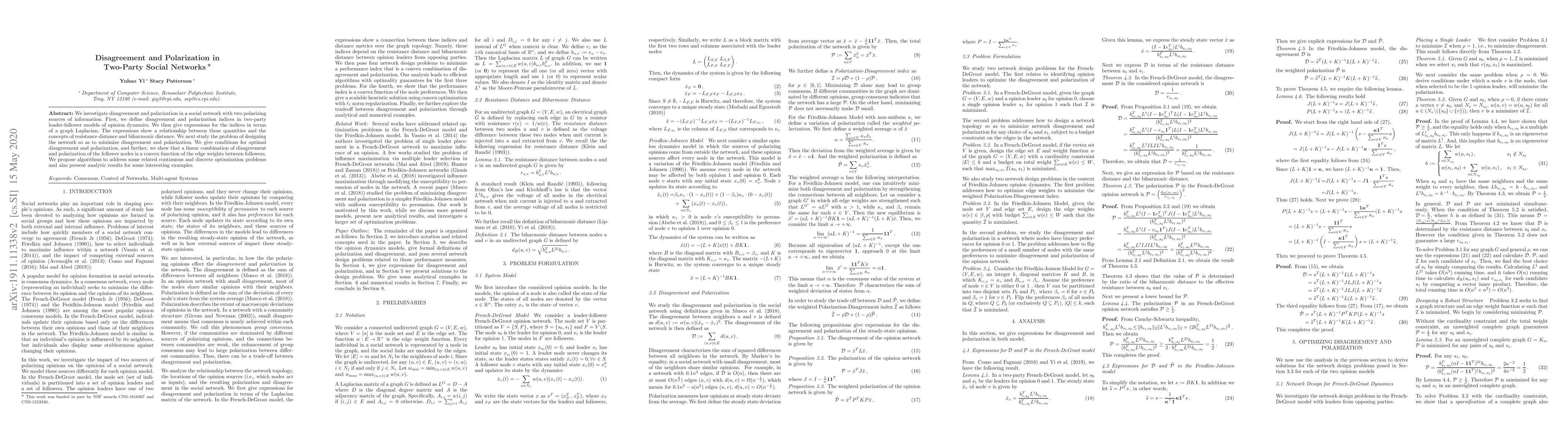 This paper explores disagreement and polarization in two-party social networks with polarizing information sources, defining indices for these phenomena and linking them to graph Laplacian properties. It proposes optimization algorithms to minimize these indices and presents conditions for optimal network design.
