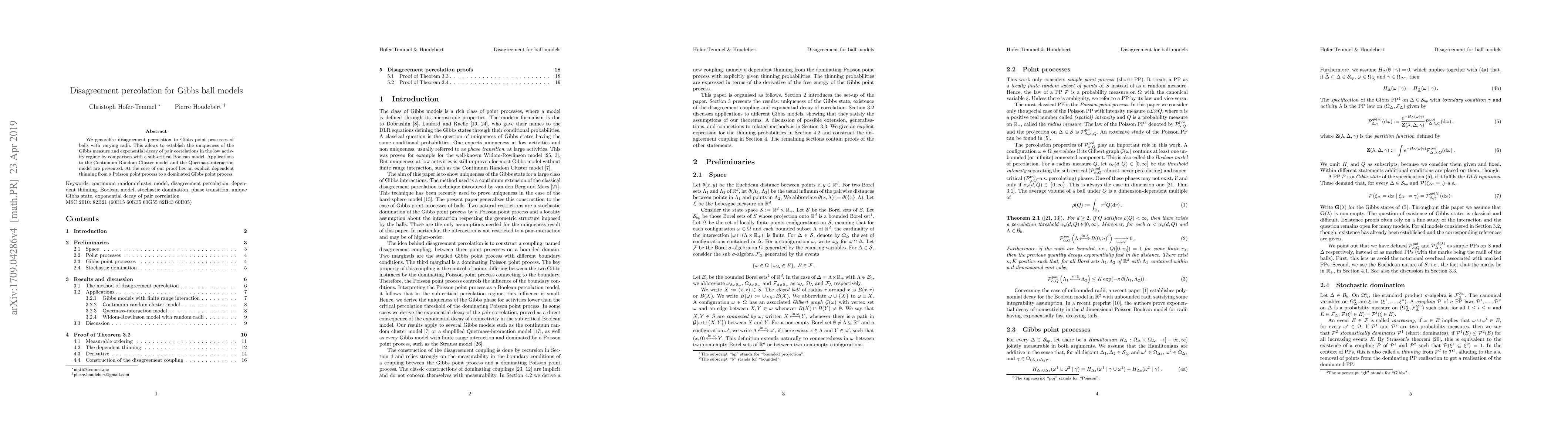 This paper generalises disagreement percolation to Gibbs point processes of balls, establishing uniqueness of the Gibbs measure and exponential decay of pair correlations. The proof employs an explicit dependent thinning from a Poisson point process, with applications to the Continuum Random Cluster and Quermass-interaction models.