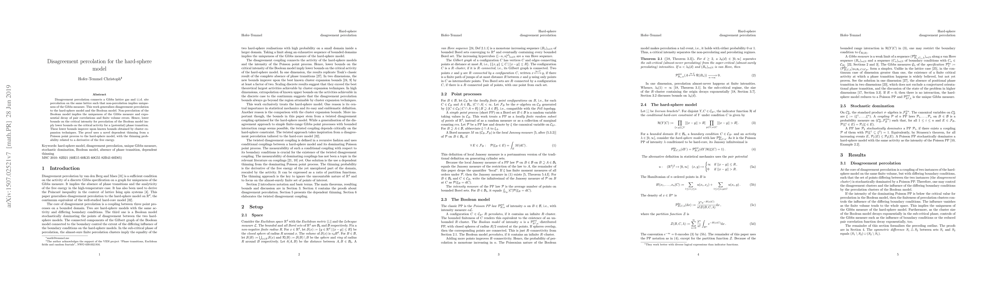 This paper generalizes disagreement percolation to the hard-sphere model and the Boolean model, showing that non-percolation implies uniqueness of the Gibbs measure and exponential decay of pair correlations. It improves lower bounds on critical intensity for percolation using a novel dependent thinning method.