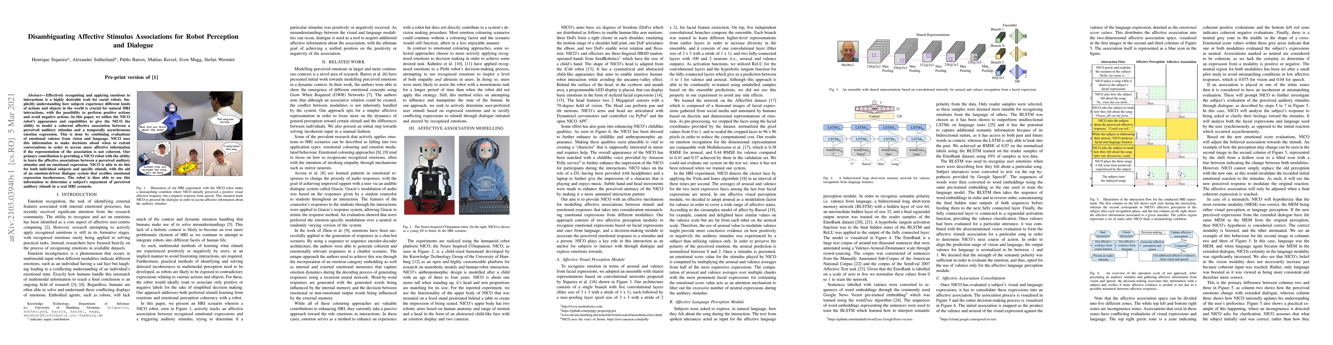 Effectively recognising and applying emotions to interactions is a highly desirable trait for social robots. Implicitly understanding how subjects experience different kinds of actions and objects in the world is crucial for natural HRI interactions, with the possibility to perform positive actions and avoid negative actions. In this paper, we utilize the NICO robot's appearance and capabilities to give the NICO the ability to model a coherent affective association between a perceived auditory stimulus and a temporally asynchronous emotion expression. This is done by combining evaluations of emotional valence from vision and language. NICO uses this information to make decisions about when to extend conversations in order to accrue more affective information if the representation of the association is not coherent. Our primary contribution is providing a NICO robot with the ability to learn the affective associations between a perceived auditory stimulus and an emotional expression. NICO is able to do this for both individual subjects and specific stimuli, with the aid of an emotion-driven dialogue system that rectifies emotional expression incoherences. The robot is then able to use this information to determine a subject's enjoyment of perceived auditory stimuli in a real HRI scenario.