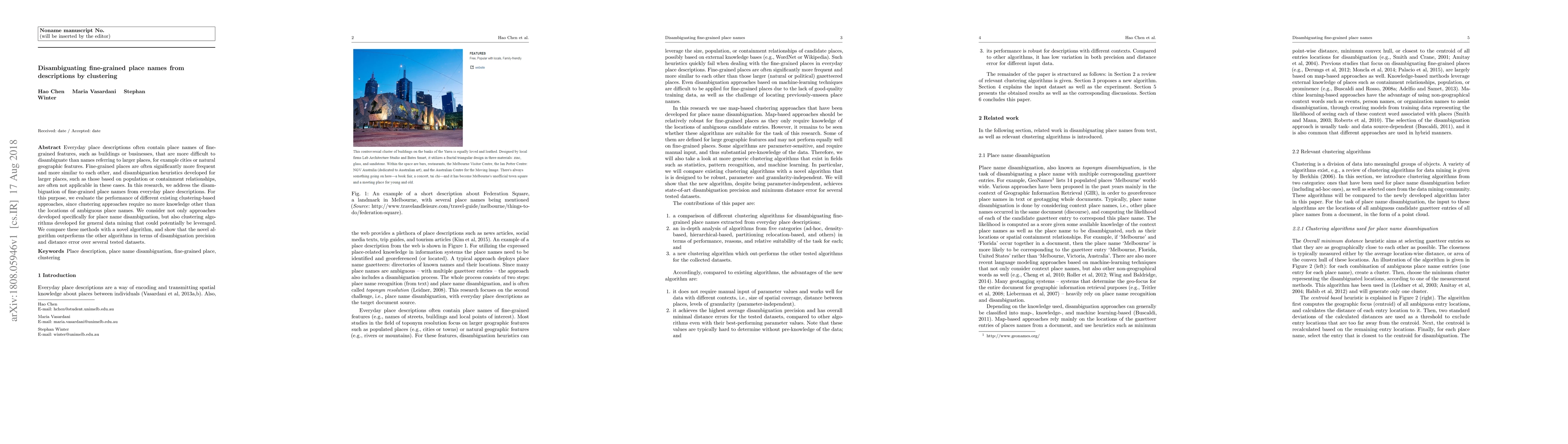 This paper investigates clustering-based methods for disambiguating fine-grained place names from everyday descriptions, comparing existing approaches and introducing a novel algorithm that outperforms them in precision and error reduction across various datasets.