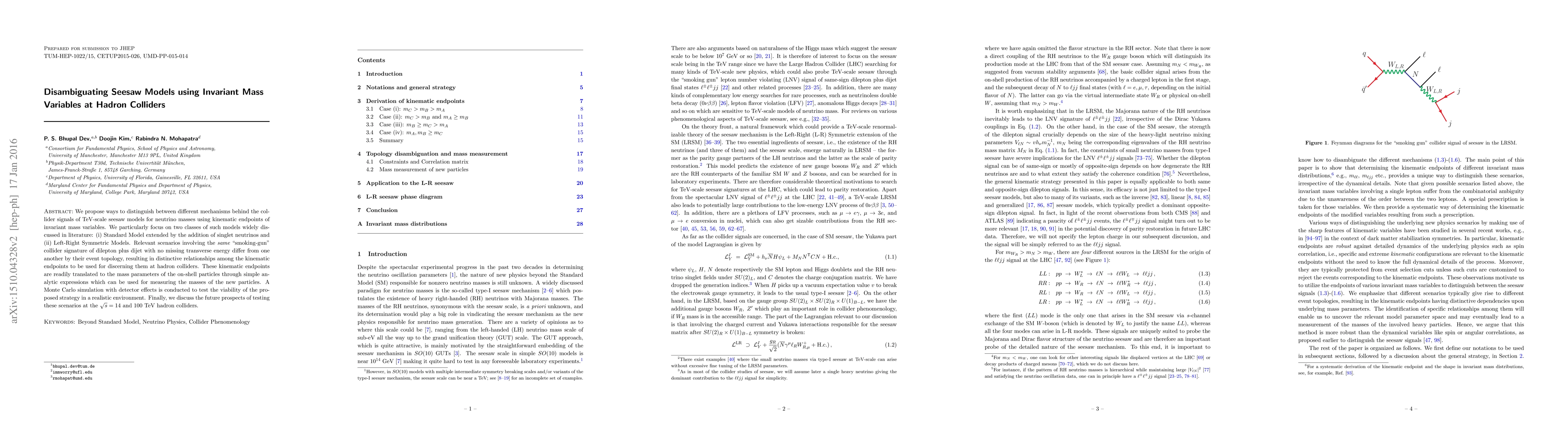 The research proposes distinguishing between TeV-scale seesaw models for neutrino masses using kinematic endpoints of invariant mass variables at hadron colliders, focusing on Standard Model extensions with singlet neutrinos and Left-Right Symmetric Models.