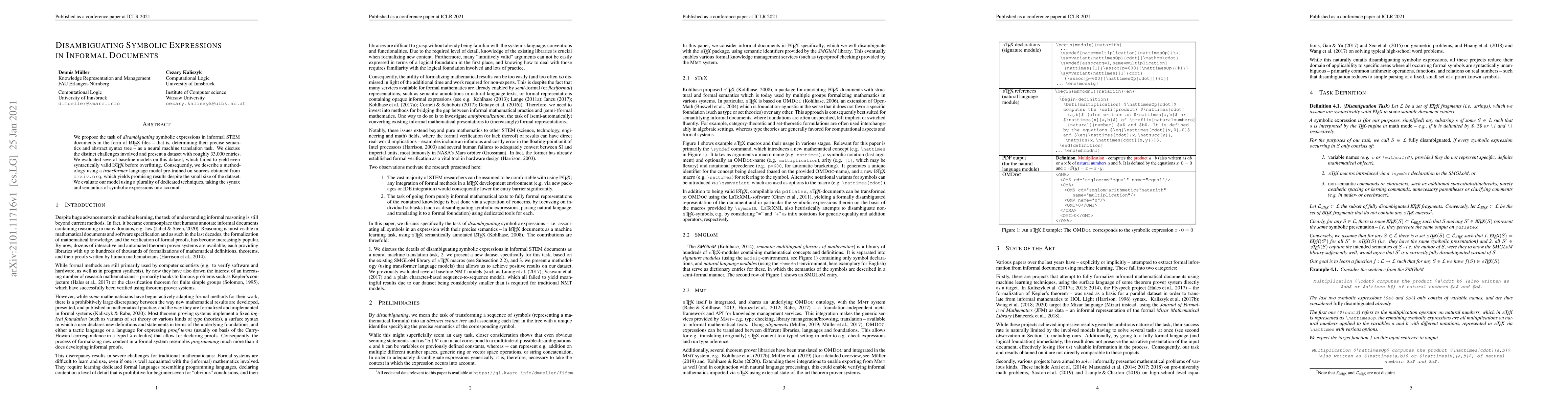 We propose the task of disambiguating symbolic expressions in informal STEM documents in the form of LaTeX files - that is, determining their precise semantics and abstract syntax tree - as a neural machine translation task. We discuss the distinct challenges involved and present a dataset with roughly 33,000 entries. We evaluated several baseline models on this dataset, which failed to yield even syntactically valid LaTeX before overfitting. Consequently, we describe a methodology using a transformer language model pre-trained on sources obtained from arxiv.org, which yields promising results despite the small size of the dataset. We evaluate our model using a plurality of dedicated techniques, taking the syntax and semantics of symbolic expressions into account.