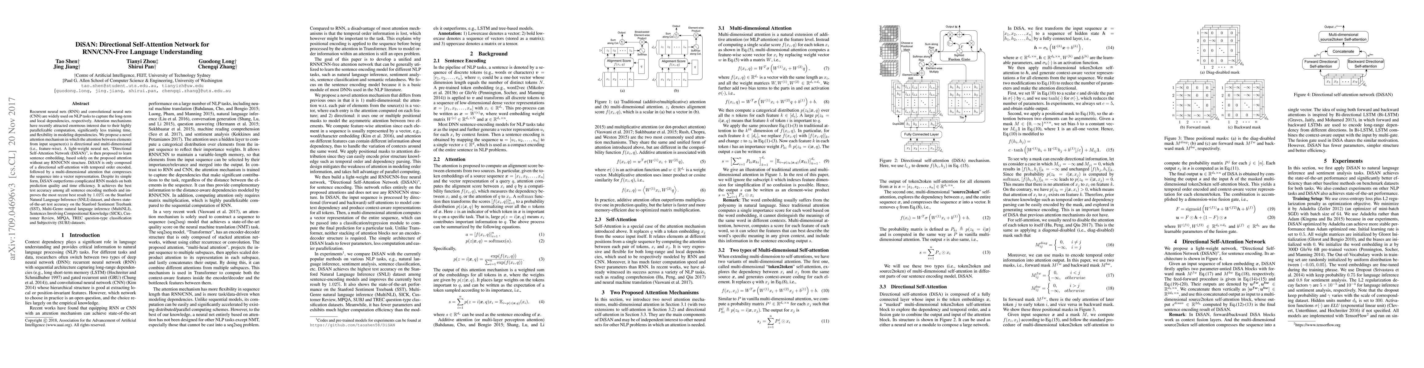 The paper proposes DiSAN, a Directional Self-Attention Network that uses a novel attention mechanism to generate sentence embeddings without relying on RNNs or CNNs. DiSAN outperforms complex RNN models in both accuracy and efficiency, achieving state-of-the-art results on multiple NLP datasets.