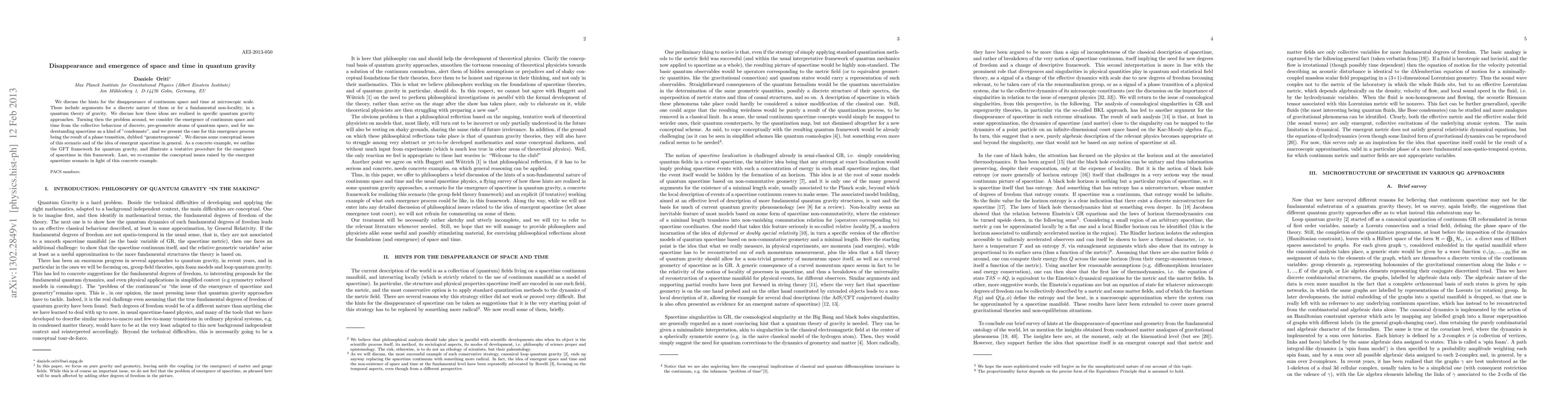This paper explores the disappearance of space and time at the quantum gravity scale and their potential discrete nature or non-locality. It also discusses the emergence of continuum spacetime from the collective behavior of quantum space's pre-geometric atoms, proposing a phase transition termed "geometrogenesis." The GFT framework for quantum gravity is used to illustrate this emergence process.