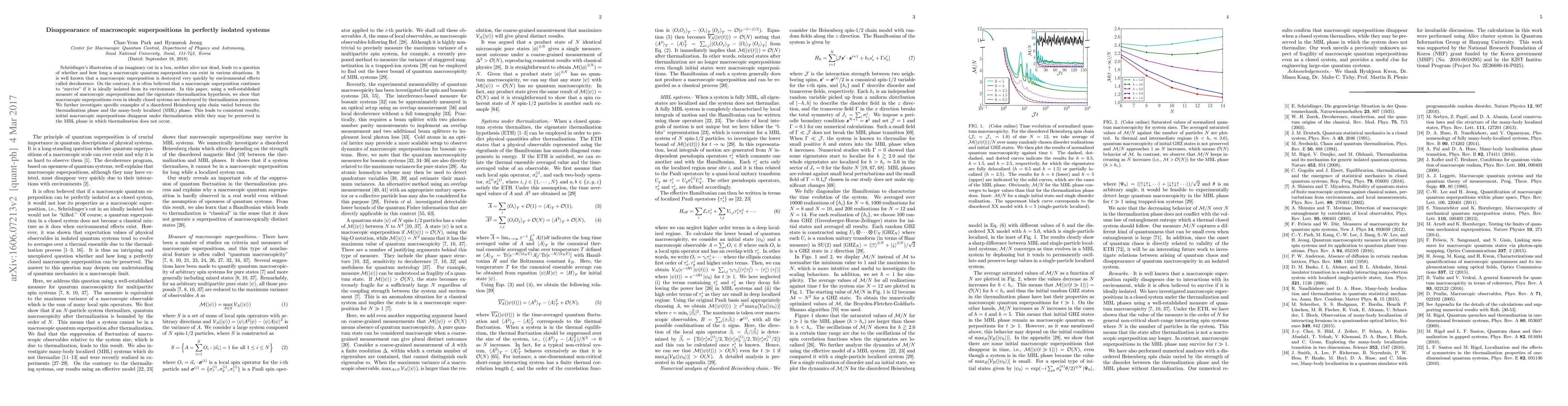 This paper demonstrates that macroscopic quantum superpositions, even in perfectly isolated systems, are destroyed by thermalization processes rather than persisting indefinitely. It uses the eigenstate thermalization hypothesis to show that thermalization leads to the disappearance of initial superpositions, contrasting with the many-body localized phase where such superpositions may be preserved.