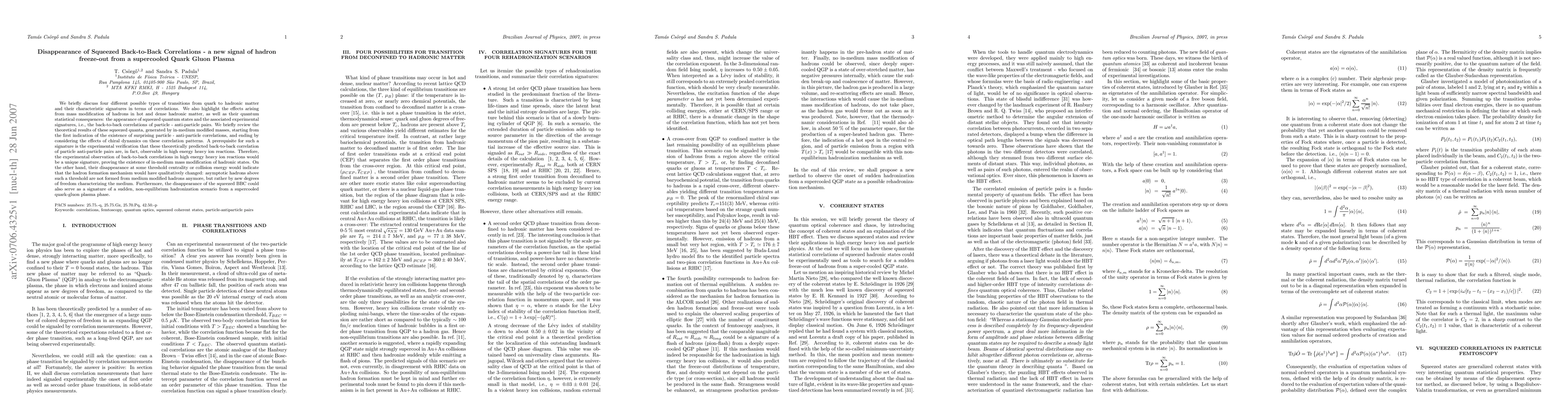 This paper explores the disappearance of squeezed back-to-back correlations (BBC) as a potential signal of hadron freeze-out from a supercooled Quark Gluon Plasma (QGP). It discusses the theoretical basis for these correlations arising from in-medium mass modifications and their experimental observability in high energy heavy ion collisions, suggesting their disappearance indicates a change in hadron formation mechanisms.