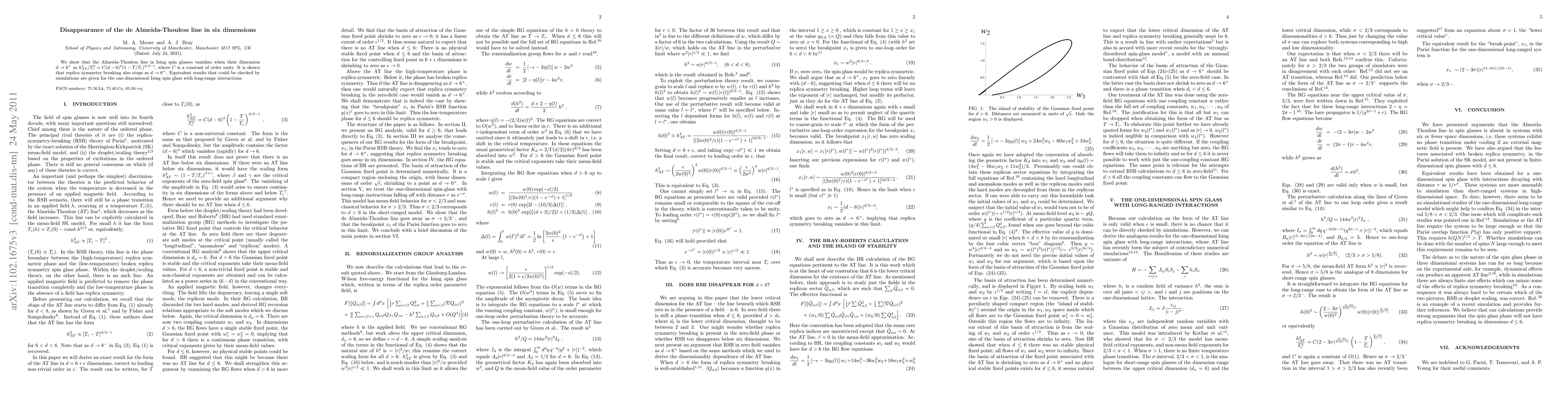 The Almeida-Thouless line in Ising spin glasses disappears as the dimension approaches six, with the ratio h_{AT}^2/T_c^2 scaling as C(d-6)^4(1- T/T_c)^{d/2 - 1}. Replica symmetry breaking ceases as the dimension approaches six, indicating a significant phase transition in higher-dimensional spin glasses.