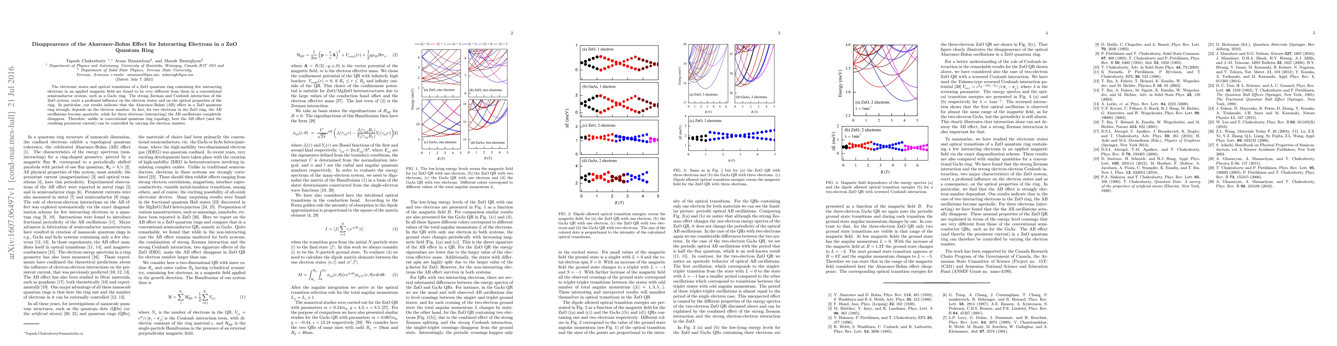 The study reveals that the Aharonov-Bohm effect in ZnO quantum rings is significantly influenced by electron interactions, with the effect disappearing for three interacting electrons, contrasting with conventional semiconductor systems. The electron number can thus control the AB effect and persistent current in these rings.