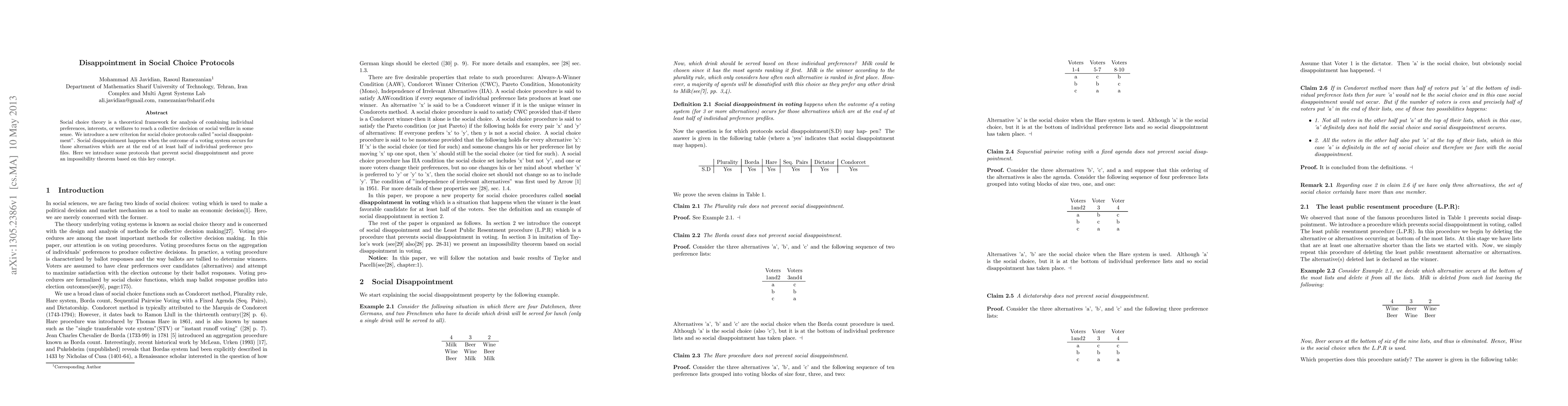 The research introduces a new criterion for social choice protocols called social disappointment, which occurs when the outcome is for alternatives preferred last by at least half of individual preference profiles. It then presents protocols that prevent social disappointment and proves an impossibility theorem based on this concept.
