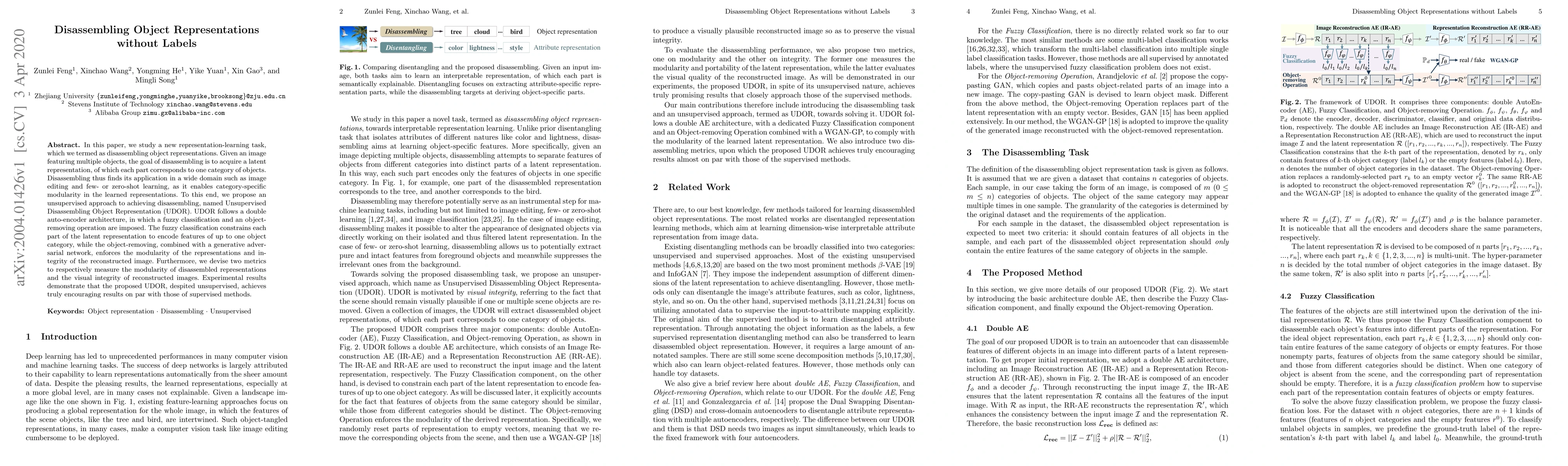 This paper introduces an unsupervised method, UDOR, for disassembling object representations in images into category-specific parts using a double auto-encoder with fuzzy classification and object-removing operations. Experimental results show UDOR achieves results comparable to supervised methods, enabling applications in image editing and few- or zero-shot learning.