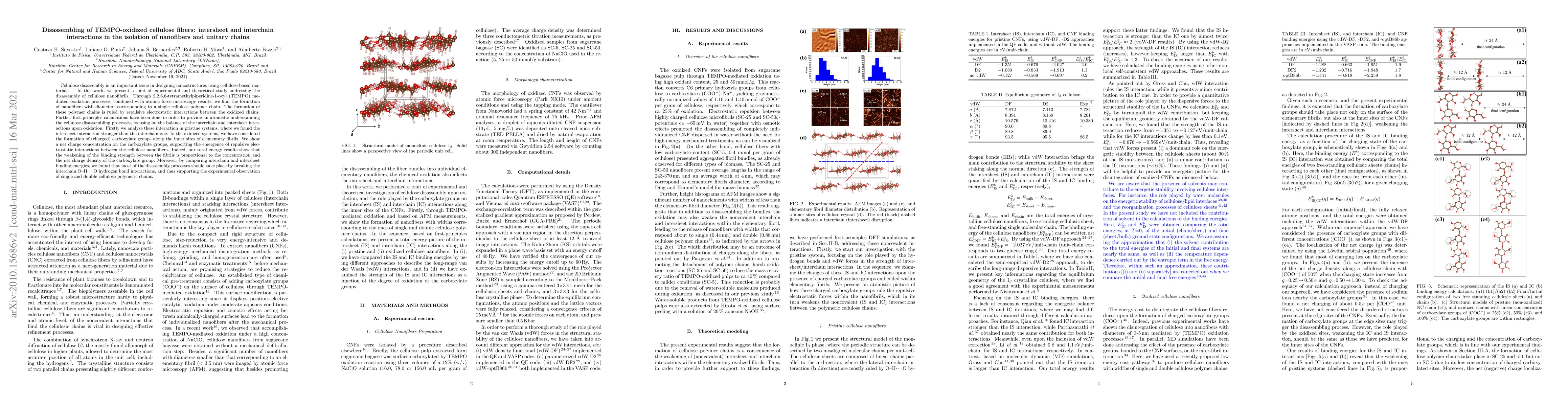 Cellulose disassembly is an important issue in designing nanostructures using cellulose-based materials. In this work, we present a joint of experimental and theoretical study addressing the disassembly of cellulose nanofibrils. Through 2,2,6,6-tetramethylpiperidine-1-oxyl (TEMPO) mediated oxidation processes, combined with atomic force microscopy results, we find the formation of nanofibers with diameters corresponding to a single cellulose polymer chain. The formation of these polymer chains is ruled by repulsive electrostatic interactions between the oxidized chains. Further first-principles calculations have been done in order to provide an atomistic understanding the cellulose disassembling processes, focusing on the balance of the interchain and intersheet interactions upon oxidation. Firstly we analyse these interaction in pristine systems, where we found the intersheet interaction stronger than the interchain one. In the oxidized systems, we have considered the formation of (charged) carboxylate groups along the inner sites of elementary fibrils. We show a net charge concentration on the carboxylate groups, supporting the emergence of repulsive electrostatic interactions between the cellulose nanofibers. Indeed, our total energy results show that the weakening of the binding strength between the fibrils is proportional to the concentration and the net charge density of the carboxylate group. Moreover, by comparing interchain and intersheet binding energies, we found that most of the disassembly processes should take place by breaking the interchain O--H$\cdots$O hydrogen bond interactions, and thus supporting the experimental observation of single and double cellulose polymeric chains.