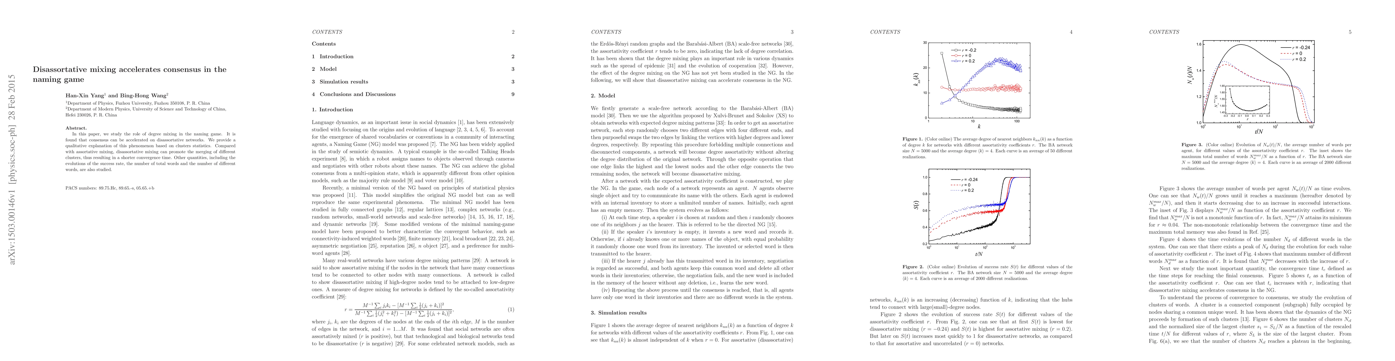 Disassortative mixing in the naming game leads to faster consensus formation compared to assortative mixing by promoting the merging of different clusters. This accelerates convergence, evidenced by a shorter time to reach agreement on word meanings.