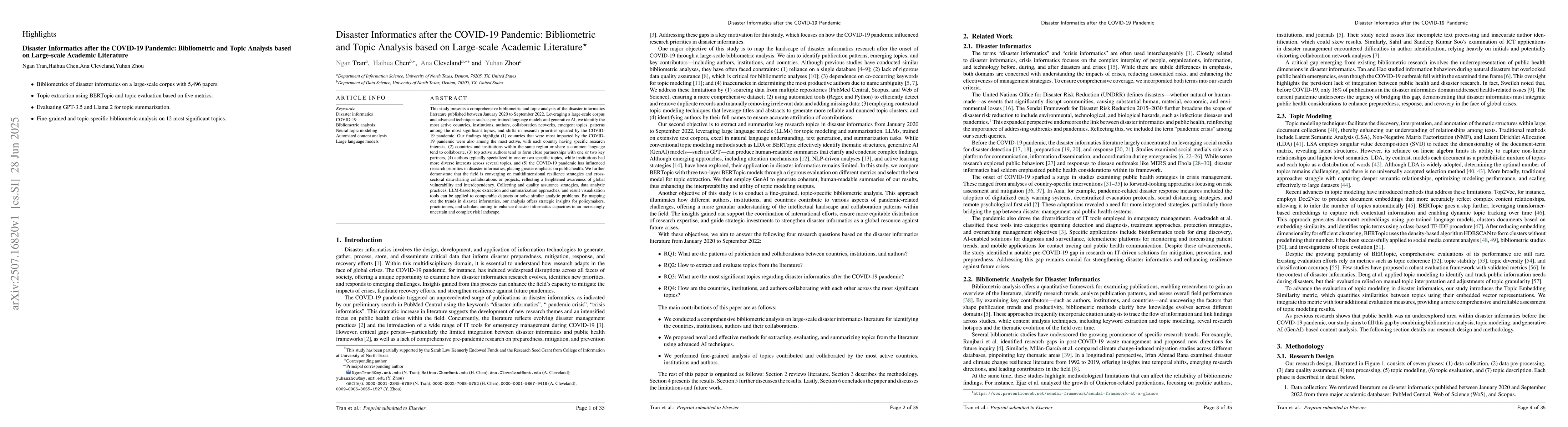 This study presents a comprehensive bibliometric and topic analysis of the disaster informatics literature published between January 2020 to September 2022. Leveraging a large-scale corpus and advanced techniques such as pre-trained language models and generative AI, we identify the most active countries, institutions, authors, collaboration networks, emergent topics, patterns among the most significant topics, and shifts in research priorities spurred by the COVID-19 pandemic. Our findings highlight (1) countries that were most impacted by the COVID-19 pandemic were also among the most active, with each country having specific research interests, (2) countries and institutions within the same region or share a common language tend to collaborate, (3) top active authors tend to form close partnerships with one or two key partners, (4) authors typically specialized in one or two specific topics, while institutions had more diverse interests across several topics, and (5) the COVID-19 pandemic has influenced research priorities in disaster informatics, placing greater emphasis on public health. We further demonstrate that the field is converging on multidimensional resilience strategies and cross-sectoral data-sharing collaborations or projects, reflecting a heightened awareness of global vulnerability and interdependency. Collecting and quality assurance strategies, data analytic practices, LLM-based topic extraction and summarization approaches, and result visualization tools can be applied to comparable datasets or solve similar analytic problems. By mapping out the trends in disaster informatics, our analysis offers strategic insights for policymakers, practitioners, and scholars aiming to enhance disaster informatics capacities in an increasingly uncertain and complex risk landscape.