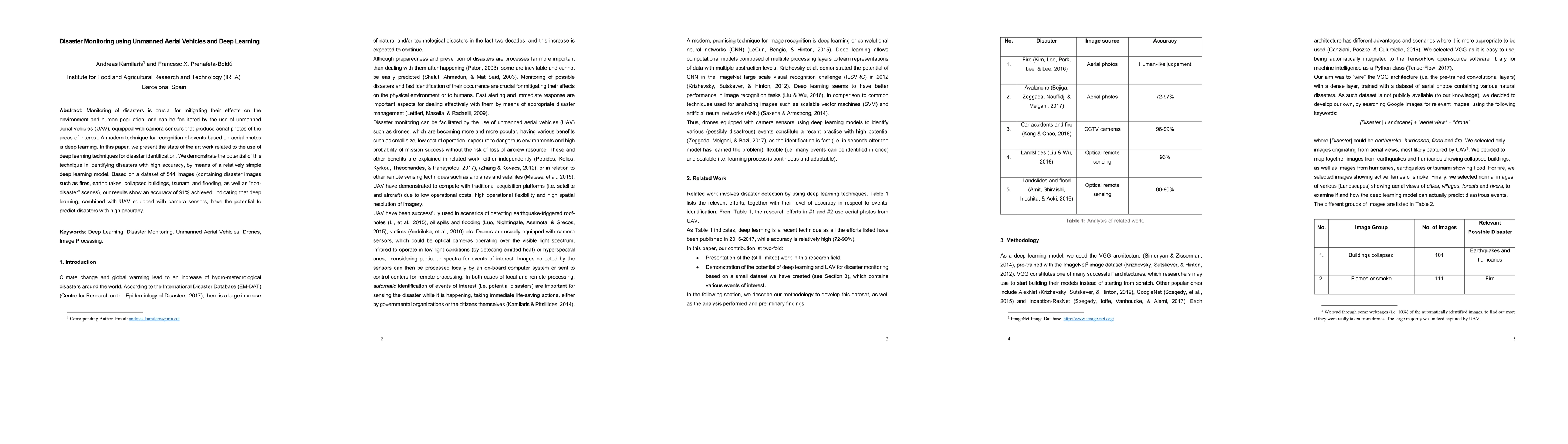 Monitoring of disasters is crucial for mitigating their effects on the environment and human population, and can be facilitated by the use of unmanned aerial vehicles (UAV), equipped with camera sensors that produce aerial photos of the areas of interest. A modern technique for recognition of events based on aerial photos is deep learning. In this paper, we present the state of the art work related to the use of deep learning techniques for disaster identification. We demonstrate the potential of this technique in identifying disasters with high accuracy, by means of a relatively simple deep learning model. Based on a dataset of 544 images (containing disaster images such as fires, earthquakes, collapsed buildings, tsunami and flooding, as well as non-disaster scenes), our results show an accuracy of 91% achieved, indicating that deep learning, combined with UAV equipped with camera sensors, have the potential to predict disasters with high accuracy.