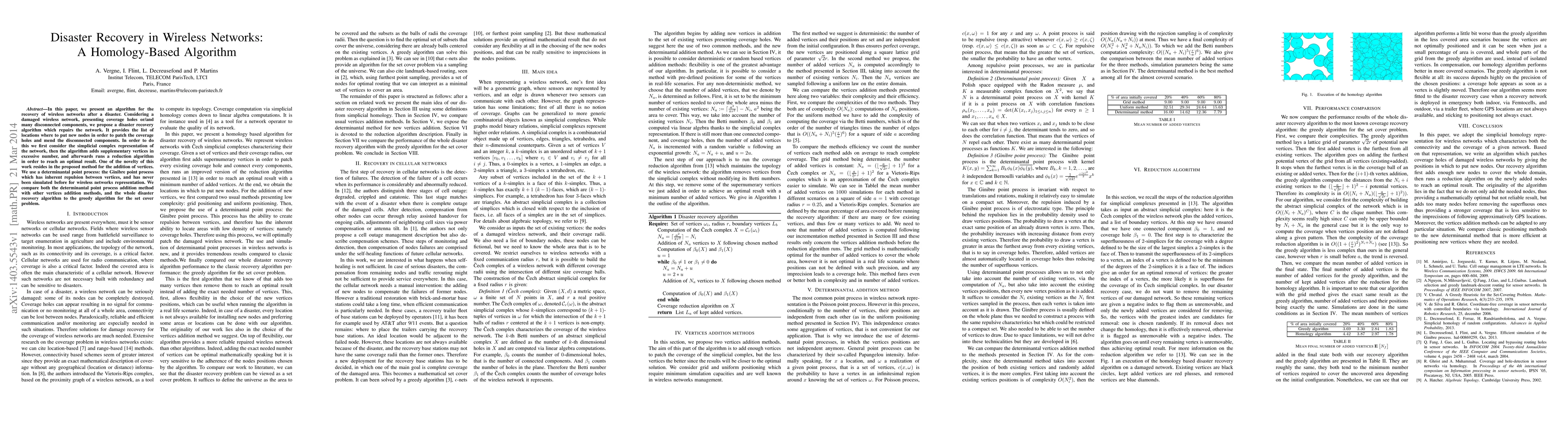 In this paper, we present an algorithm for the recovery of wireless networks after a disaster. Considering a damaged wireless network, presenting coverage holes or/and many disconnected components, we propose a disaster recovery algorithm which repairs the network. It provides the list of locations where to put new nodes in order to patch the coverage holes and mend the disconnected components. In order to do this we first consider the simplicial complex representation of the network, then the algorithm adds supplementary vertices in excessive number, and afterwards runs a reduction algorithm in order to reach an optimal result. One of the novelty of this work resides in the proposed method for the addition of vertices. We use a determinantal point process: the Ginibre point process which has inherent repulsion between vertices, and has never been simulated before for wireless networks representation. We compare both the determinantal point process addition method with other vertices addition methods, and the whole disaster recovery algorithm to the greedy algorithm for the set cover problem.