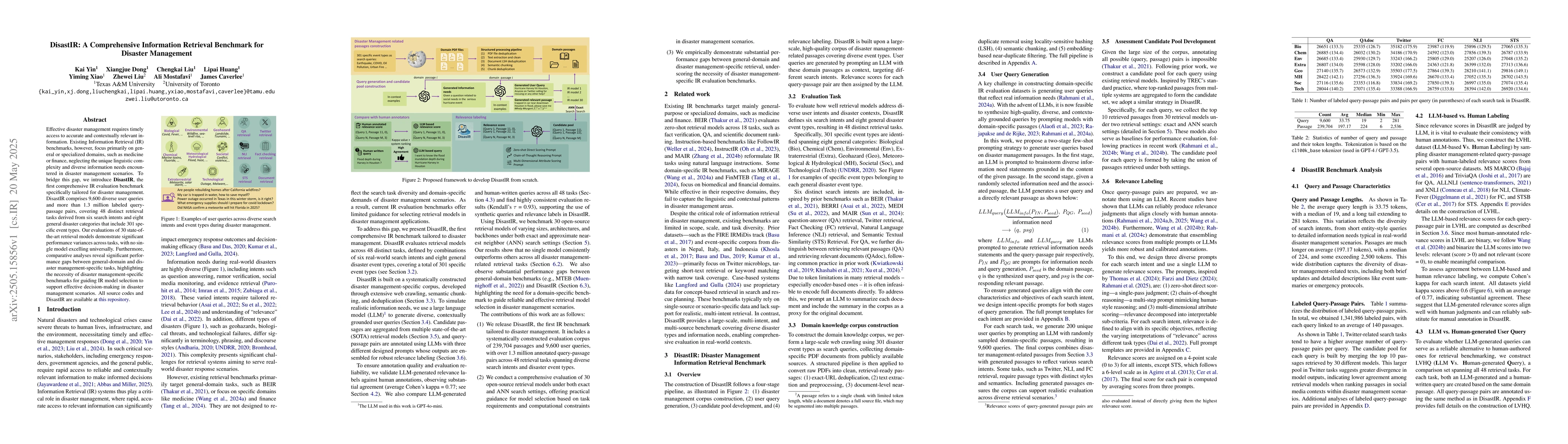 DisastIR is a comprehensive information retrieval benchmark for disaster management, featuring 9,600 user queries and 1.3 million labeled query-passage pairs, to evaluate the performance of state-of-the-art retrieval models in this unique domain.