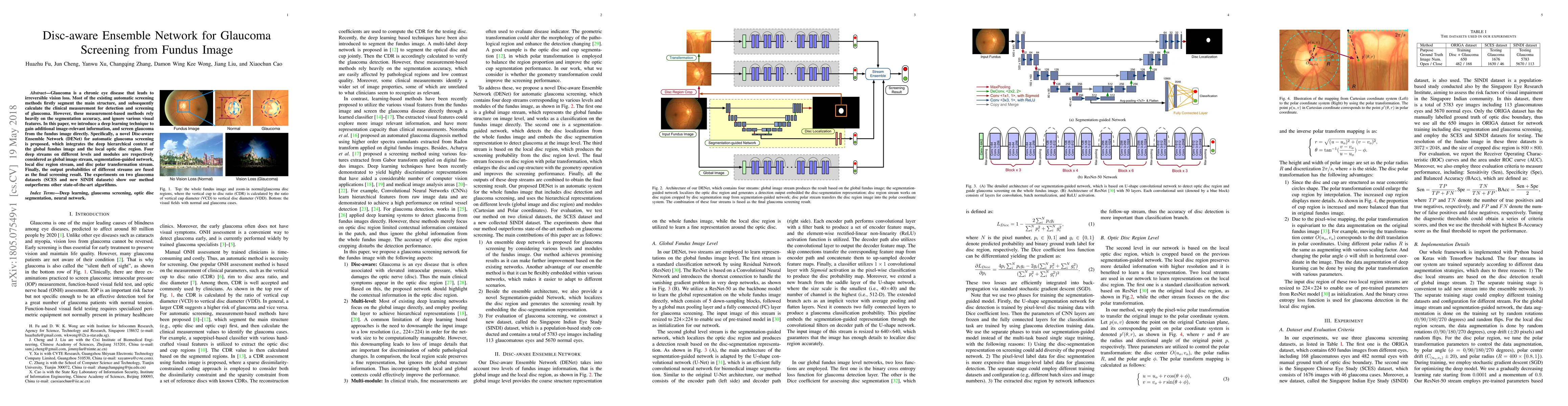 The paper proposes a Disc-aware Ensemble Network (DENet) for automatic glaucoma screening from fundus images, integrating global and local features to enhance detection accuracy. Experiments demonstrate DENet's superior performance over existing methods on two glaucoma datasets.