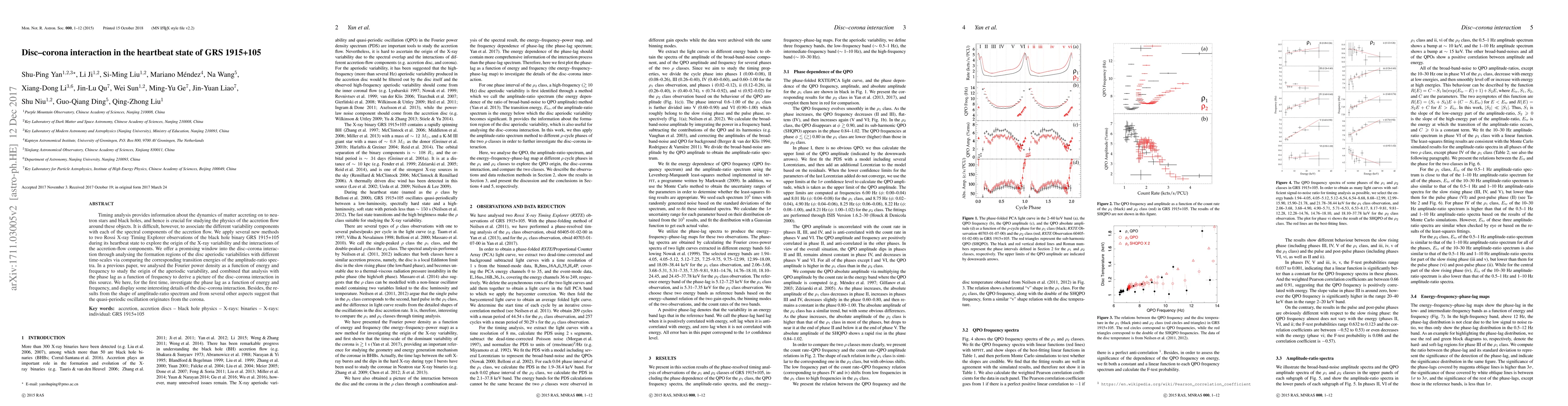 This study applies new methods to Rossi X-ray Timing Explorer data of black hole binary GRS 1915+105 during its 'heartbeat state' to explore X-ray variability origins and disc-corona interactions. Key findings include analyzing phase lag as a function of energy and frequency, suggesting the quasi-periodic oscillation originates from the corona, and offering insights into disc-corona interaction via amplitude-ratio spectrum and other aspects.