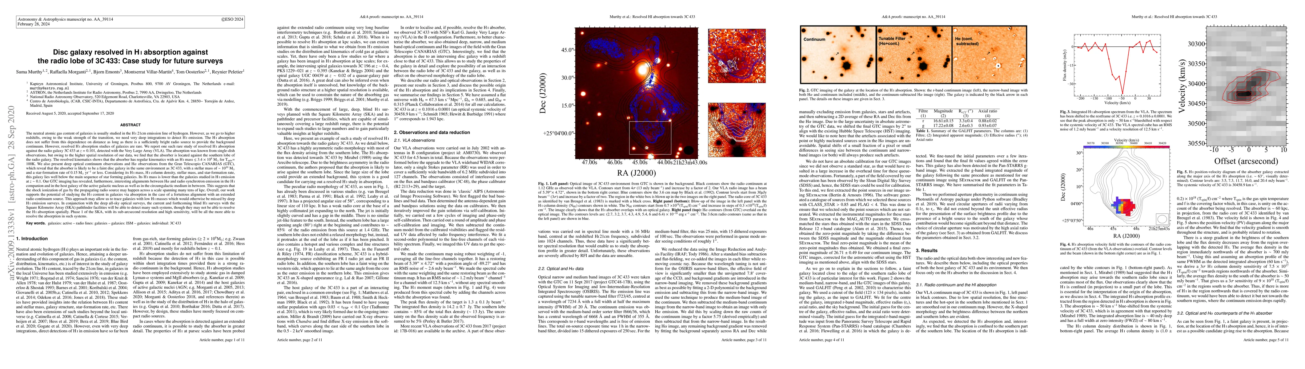 The neutral atomic gas content of galaxies is usually studied in the HI 21cm emission line of hydrogen. However, at higher redshifts, we need very deep integrations to detect HI emission. The HI absorption does not suffer from this dependence on distance as long as there is a bright enough background radio source. However, resolved HI absorption studies of galaxies are rare. We report one such rare study of resolved HI absorption against the radio galaxy 3C 433 at $z = 0.101$ with the VLA. The resolved kinematics of the absorber, located against the southern lobe of the 3C 433, shows that it has regular kinematics with an HI mass $\lesssim 3.4 \times 10^{8} M_{\odot}$ for T$_{spin} =$ 100K. Our deep optical continuum and H$\alpha$ observations from the Gran Telescopio CANARIAS (GTC) show that the absorber is a faint disc galaxy in the same environment as 3C 433 with a stellar mass $\sim 10^{10} M_{\odot}$ and a star-formation rate of 0.15 $M_{\odot}~yr^{-1}$ or less. For its HI mass, HI column density, stellar mass, and star-formation rate, this galaxy lies well below the main sequence of star-forming galaxies. Its HI mass is lower than the galaxies studied in HI emission at $z \sim 0.1$. Our GTC imaging reveals interesting alignments between H$\alpha$ and radio emission in the HI companion and in the host galaxy of the AGN as well as in the circumgalactic medium in between. This suggests that the shock ionization of gas by the propagating radio source may happen across tens of kpc. Our work supports the potential of studying the HI content in galaxies via absorption in the case of a fortuitous alignment with an extended radio continuum. This allows us to trace galaxies with low HI masses which would otherwise be missed by deep HI emission surveys. In conjunction with the deep all-sky optical surveys, the blind HI surveys with the SKA pathfinders will be able to detect many such systems.