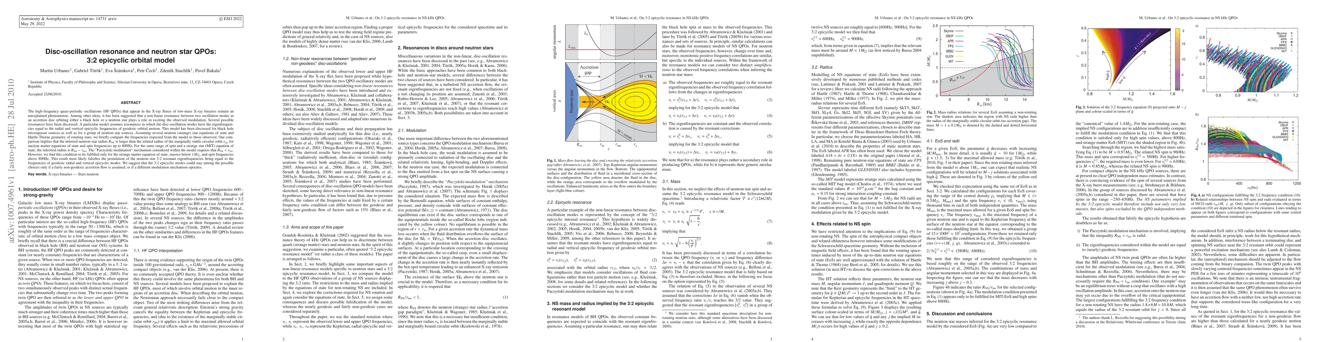 The high-frequency quasi-periodic oscillations (HF QPOs) that appear in the X-ray fluxes of low-mass X-ray binaries remain an unexplained phenomenon. Among other ideas, it has been suggested that a non-linear resonance between two oscillation modes in an accretion disc orbiting either a black hole or a neutron star plays a role in exciting the observed modulation. Several possible resonances have been discussed. A particular model assumes resonances in which the disc-oscillation modes have the eigenfrequencies equal to the radial and vertical epicyclic frequencies of geodesic orbital motion. This model has been discussed for black hole microquasar sources as well as for a group of neutron star sources. Assuming several neutron (strange) star equations of state and Hartle-Thorne geometry of rotating stars, we briefly compare the frequencies expected from the model to those observed. Our comparison implies that the inferred neutron star radius "RNS" is larger than the related radius of the marginally stable circular orbit "rms" for nuclear matter equations of state and spin frequencies up to 800Hz. For the same range of spin and a strange star (MIT) equation of state, the inferrred radius RNS is roughly equal to rms. The Paczynski modulation mechanism considered within the model requires that RNS < rms. However, we find this condition to be fulfilled only for the strange matter equation of state, masses below one solar mass, and spin frequencies above 800Hz. This result most likely falsifies the postulation of the neutron star 3:2 resonant eigenfrequencies being equal to the frequencies of geodesic radial and vertical epicyclic modes. We suggest that the 3:2 epicyclic modes could stay among the possible choices only if a fairly non-geodesic accretion flow is assumed, or if a different modulation mechanism operates.