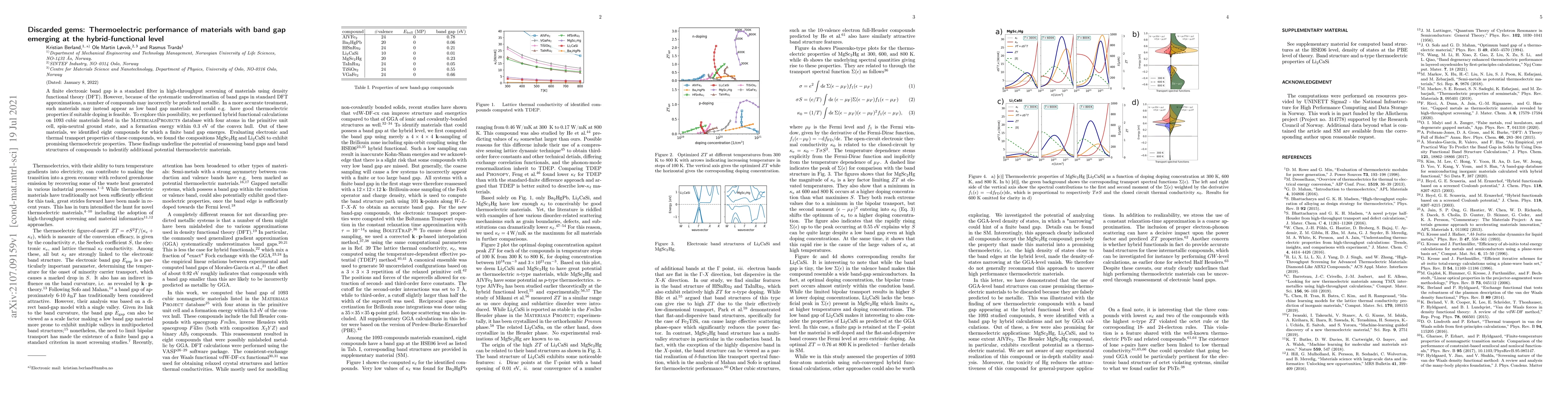 This study reassesses the thermoelectric potential of 1093 materials using hybrid functional calculations to correct for band gap underestimation in standard DFT. It identifies eight compounds with emerging finite band gaps, notably MgSc2 Hg and Li2 CaSi, which show promising thermoelectric properties, suggesting the value of accurate band gap assessments in material discovery.