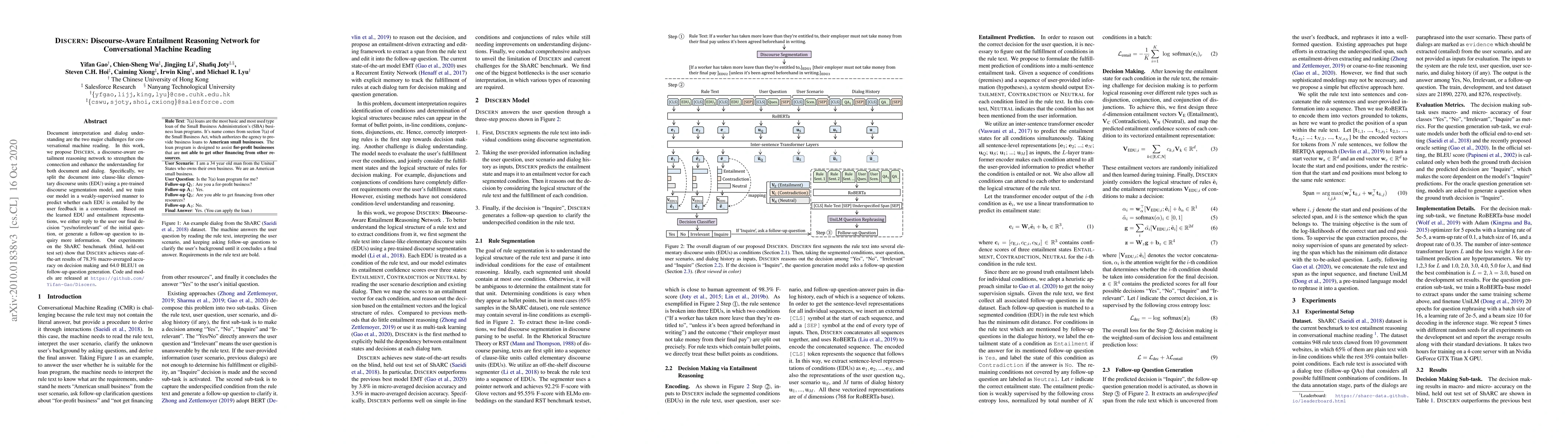 Discern is a discourse-aware entailment reasoning network designed to improve conversational machine reading by interpreting documents and understanding dialogs. It segments documents into discourse units and predicts entailment based on user feedback, achieving state-of-the-art results in decision making and follow-up question generation.