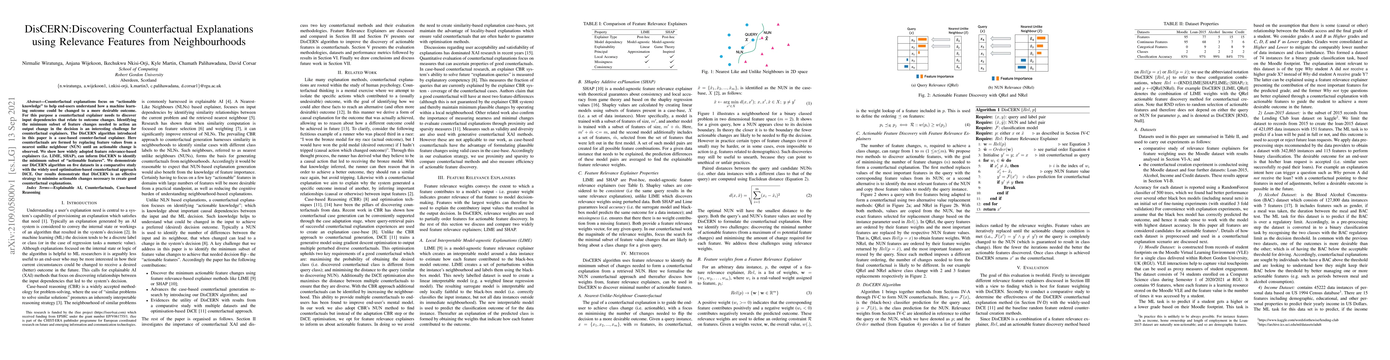 The DisCERN algorithm discovers counterfactual explanations by identifying the minimum subset of relevant feature changes needed to alter machine learning outcomes, using relevance features from neighboring data points. Comparative studies show that DisCERN outperforms the optimization-based DiCE method in generating effective counterfactual explanations.