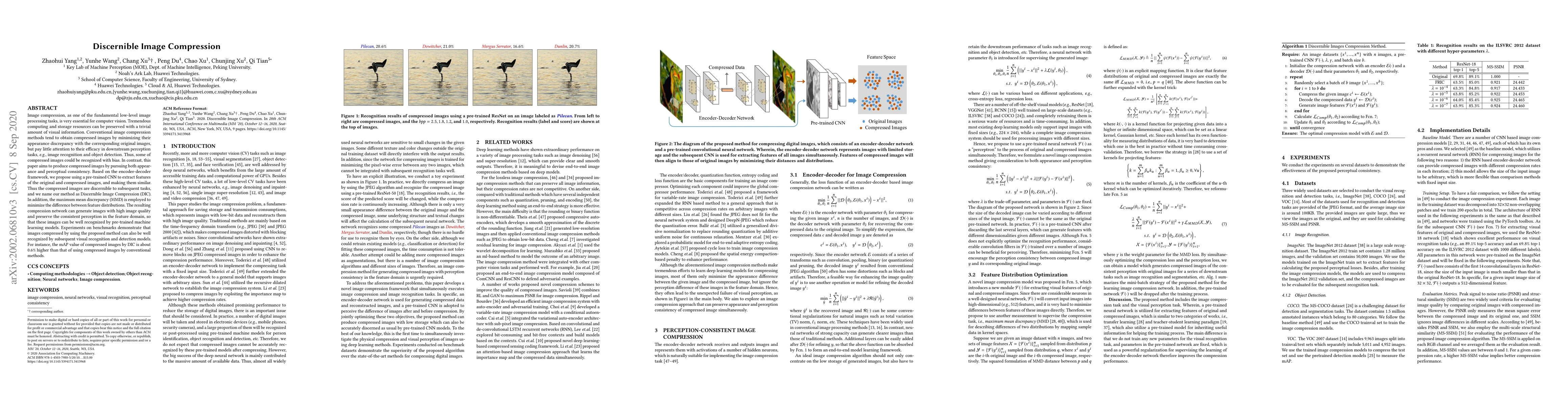 Image compression, as one of the fundamental low-level image processing tasks, is very essential for computer vision. Tremendous computing and storage resources can be preserved with a trivial amount of visual information. Conventional image compression methods tend to obtain compressed images by minimizing their appearance discrepancy with the corresponding original images, but pay little attention to their efficacy in downstream perception tasks, e.g., image recognition and object detection. Thus, some of compressed images could be recognized with bias. In contrast, this paper aims to produce compressed images by pursuing both appearance and perceptual consistency. Based on the encoder-decoder framework, we propose using a pre-trained CNN to extract features of the original and compressed images, and making them similar. Thus the compressed images are discernible to subsequent tasks, and we name our method as Discernible Image Compression (DIC). In addition, the maximum mean discrepancy (MMD) is employed to minimize the difference between feature distributions. The resulting compression network can generate images with high image quality and preserve the consistent perception in the feature domain, so that these images can be well recognized by pre-trained machine learning models. Experiments on benchmarks demonstrate that images compressed by using the proposed method can also be well recognized by subsequent visual recognition and detection models. For instance, the mAP value of compressed images by DIC is about 0.6% higher than that of using compressed images by conventional methods.
