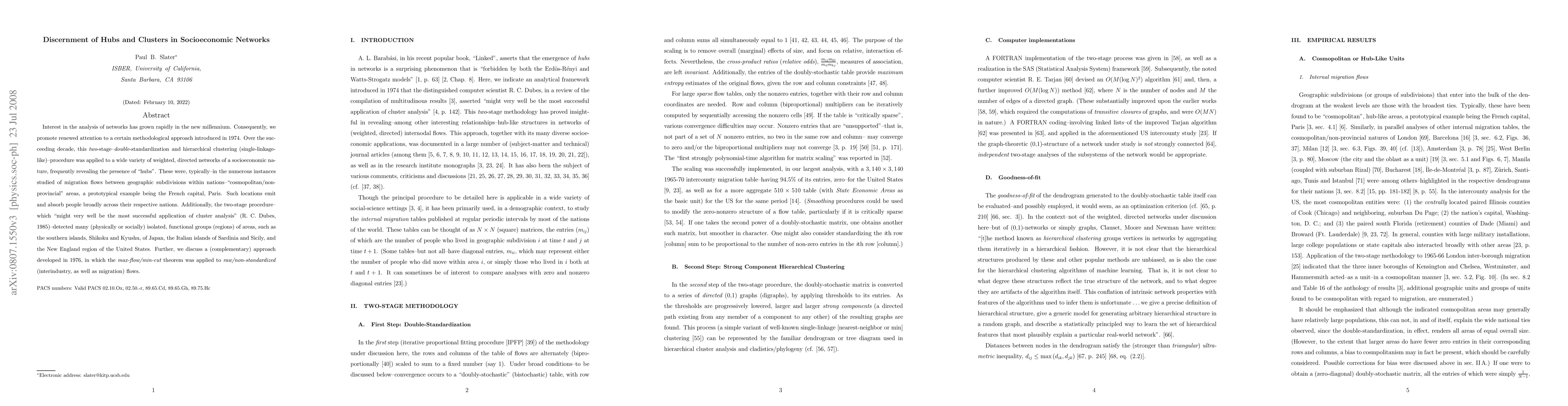 Interest in the analysis of networks has grown rapidly in the new millennium. Consequently, we promote renewed attention to a certain methodological approach introduced in 1974. Over the succeeding decade, this two-stage--double-standardization and hierarchical clustering (single-linkage-like)--procedure was applied to a wide variety of weighted, directed networks of a socioeconomic nature, frequently revealing the presence of ``hubs''. These were, typically--in the numerous instances studied of migration flows between geographic subdivisions within nations--``cosmopolitan/non-provincial'' areas, a prototypical example being the French capital, Paris. Such locations emit and absorb people broadly across their respective nations. Additionally, the two-stage procedure--which ``might very well be the most successful application of cluster analysis'' (R. C. Dubes, 1985)--detected many (physically or socially) isolated, functional groups (regions) of areas, such as the southern islands, Shikoku and Kyushu, of Japan, the Italian islands of Sardinia and Sicily, and the New England region of the United States. Further, we discuss a (complementary) approach developed in 1976, in which the max-flow/min-cut theorem was applied to raw/non-standardized (interindustry, as well as migration) flows.