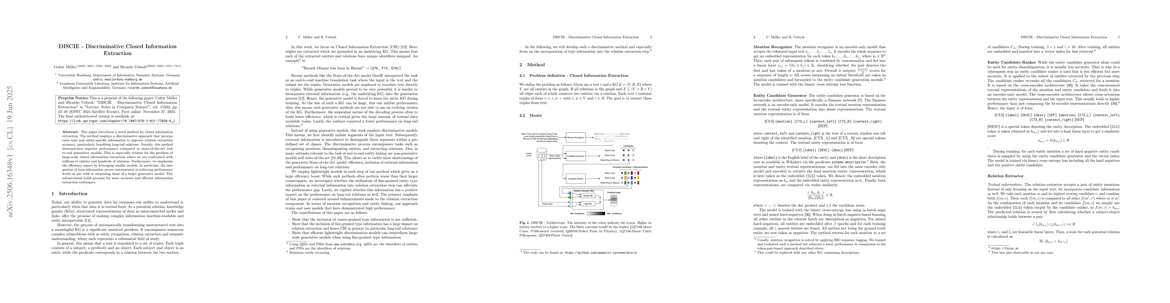 This paper introduces a novel method for closed information extraction. The method employs a discriminative approach that incorporates type and entity-specific information to improve relation extraction accuracy, particularly benefiting long-tail relations. Notably, this method demonstrates superior performance compared to state-of-the-art end-to-end generative models. This is especially evident for the problem of large-scale closed information extraction where we are confronted with millions of entities and hundreds of relations. Furthermore, we emphasize the efficiency aspect by leveraging smaller models. In particular, the integration of type-information proves instrumental in achieving performance levels on par with or surpassing those of a larger generative model. This advancement holds promise for more accurate and efficient information extraction techniques.