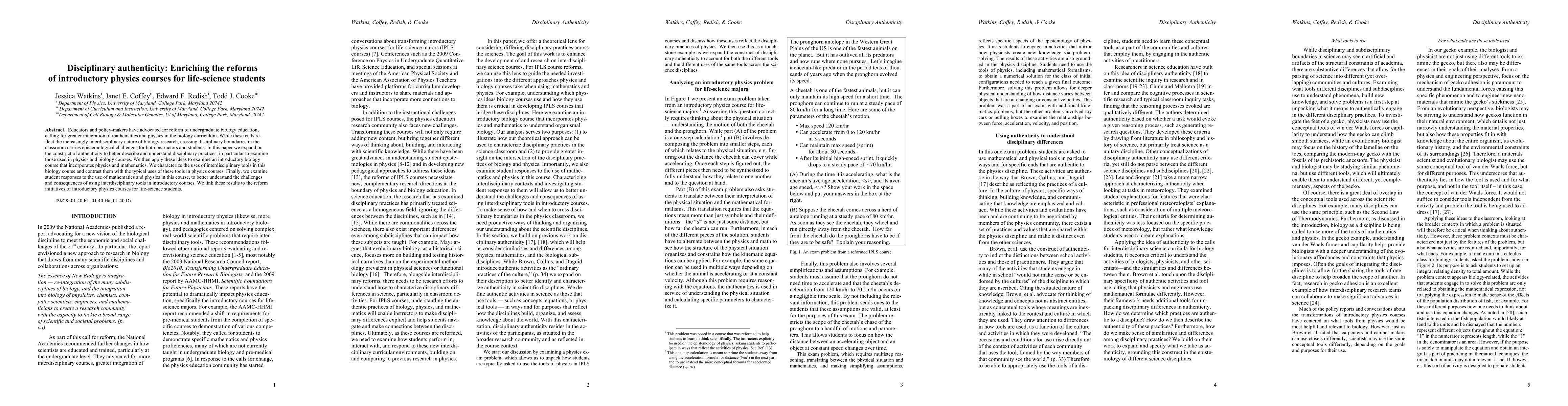 This paper explores the integration of physics and mathematics into introductory biology courses for life-science students, emphasizing the concept of disciplinary authenticity to understand and improve interdisciplinary practices. It contrasts the use of these tools in biology courses with their typical use in physics courses and assesses student responses to highlight challenges and benefits of such reforms.