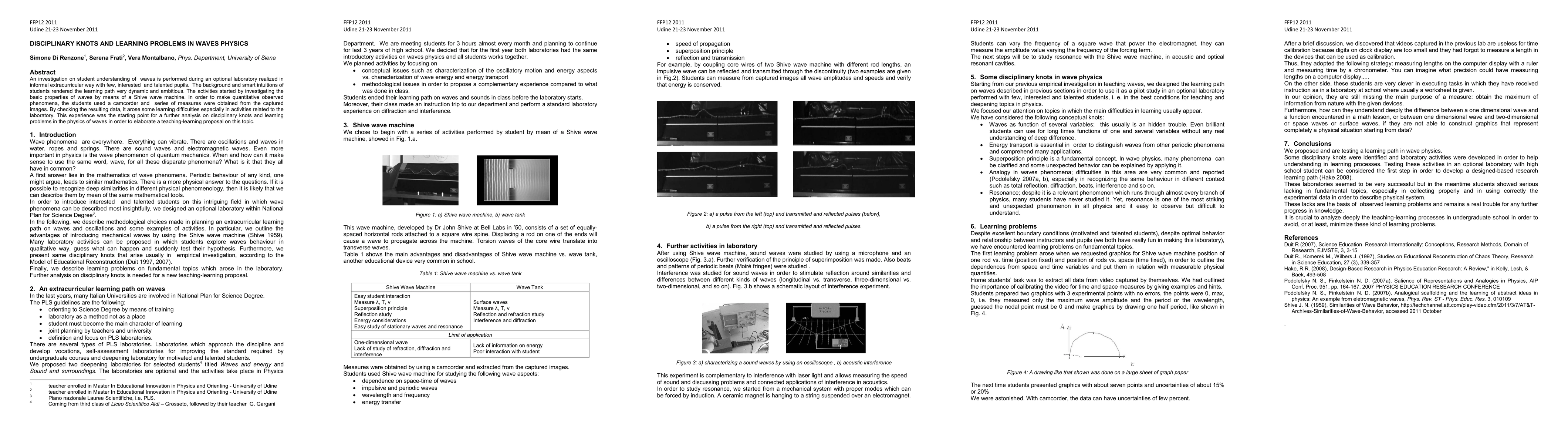 An investigation on student understanding of waves is performed during an optional laboratory realized in informal extracurricular way with few, interested and talented pupils. The background and smart intuitions of students rendered the learning path very dynamic and ambitious. The activities started by investigating the basic properties of waves by means of a Shive wave machine. In order to make quantitative observed phenomena, the students used a camcorder and series of measures were obtained from the captured images. By checking the resulting data, it arose some learning difficulties especially in activities related to the laboratory. This experience was the starting point for a further analysis on disciplinary knots and learning problems in the physics of waves in order to elaborate a teaching-learning proposal on this topic.