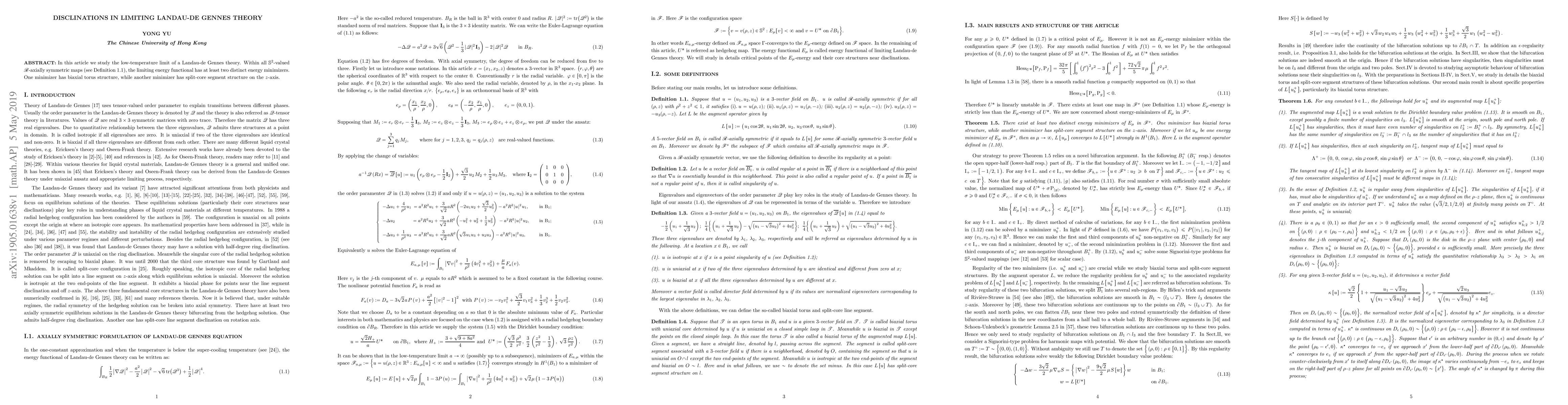 This paper explores the low-temperature limit of Landau-de Gennes theory, revealing that the limiting energy functional has at least two distinct minimizers: one with a biaxial torus structure and another with a split-core segment structure along the z-axis.