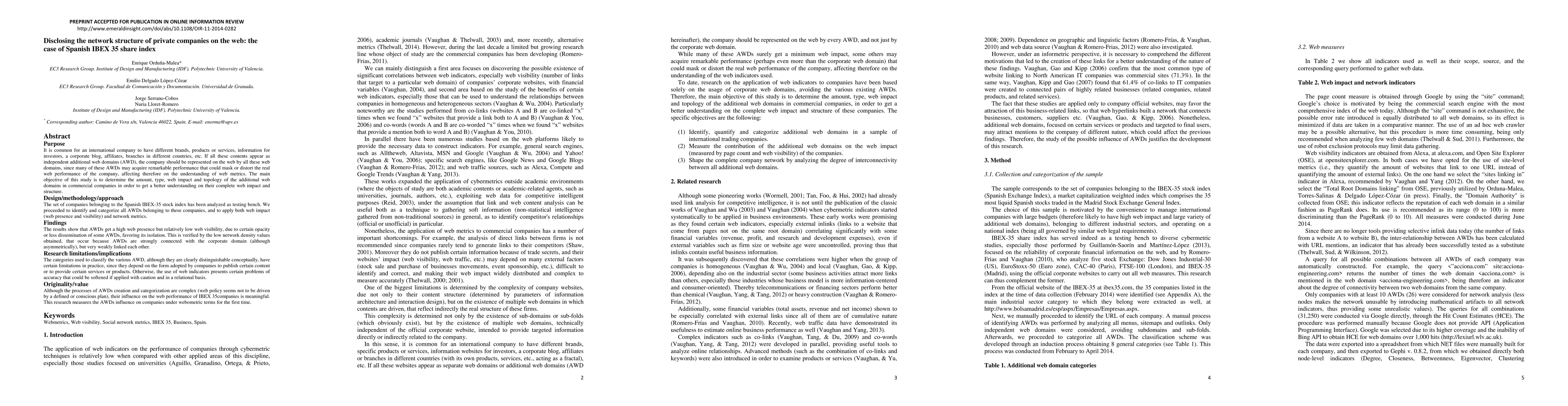 Researchers analyzed the web presence of Spanish IBEX 35 companies to understand their online structure, finding that additional web domains (AWDs) have high visibility but low connectivity, affecting overall web performance.