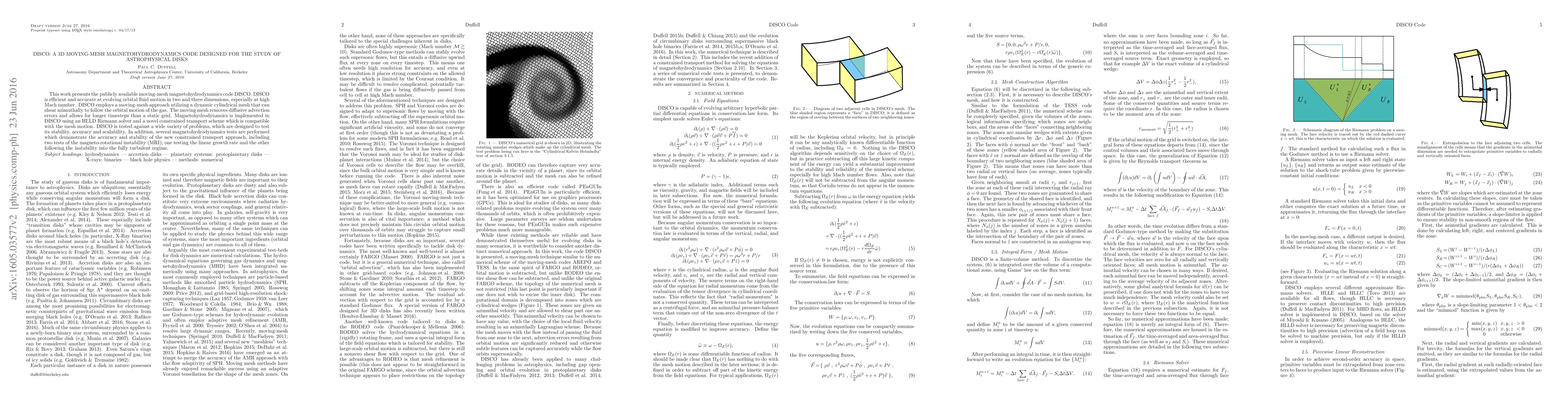 DISCO is a publicly available moving-mesh magnetohydrodynamics code designed for studying astrophysical disks, employing dynamic cylindrical meshes to follow gas orbital motion and a novel constrained transport scheme for accurate magnetohydrodynamics. It has been tested for stability, accuracy, and scalability, including successful simulations of the magneto-rotational instability.