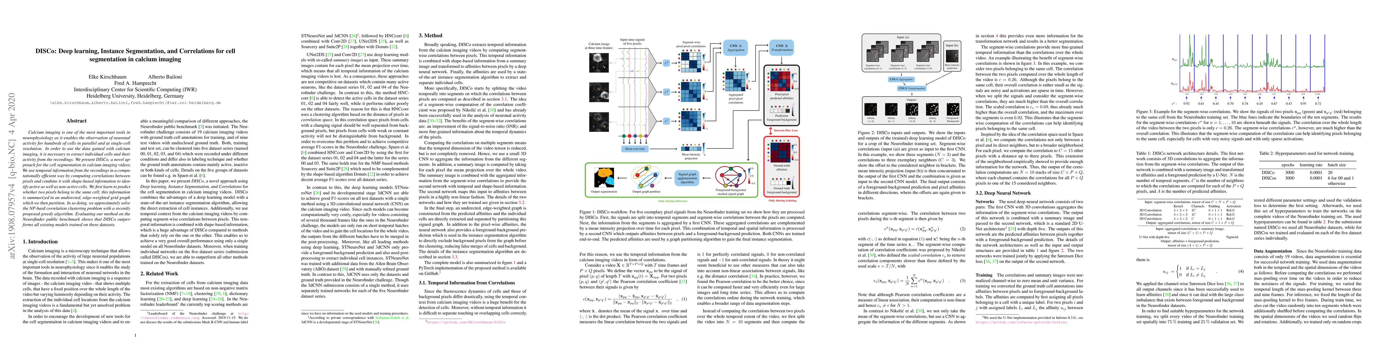 DISCo leverages deep learning, instance segmentation, and correlations to segment cells in calcium imaging data, outperforming existing models on the Neurofinder benchmark by efficiently combining temporal and shape-based information.
