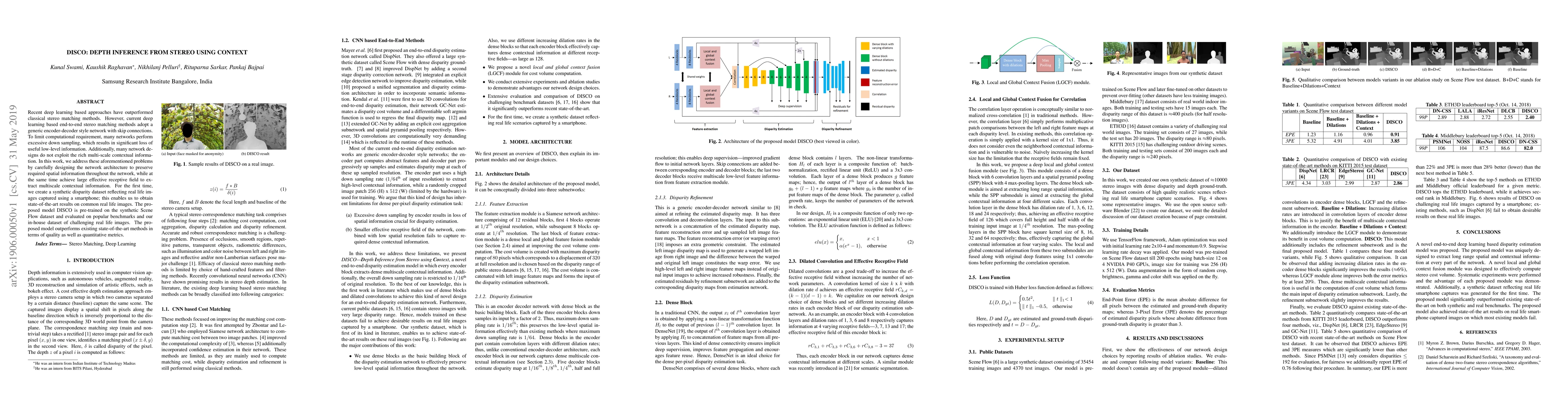 Recent deep learning based approaches have outperformed classical stereo matching methods. However, current deep learning based end-to-end stereo matching methods adopt a generic encoder-decoder style network with skip connections. To limit computational requirement, many networks perform excessive down sampling, which results in significant loss of useful low-level information. Additionally, many network designs do not exploit the rich multi-scale contextual information. In this work, we address these aforementioned problems by carefully designing the network architecture to preserve required spatial information throughout the network, while at the same time achieve large effective receptive field to extract multiscale contextual information. For the first time, we create a synthetic disparity dataset reflecting real life images captured using a smartphone; this enables us to obtain state-of-the-art results on common real life images. The proposed model DISCO is pre-trained on the synthetic Scene Flow dataset and evaluated on popular benchmarks and our in-house dataset of challenging real life images. The proposed model outperforms existing state-of-the-art methods in terms of quality as well as quantitative metrics.