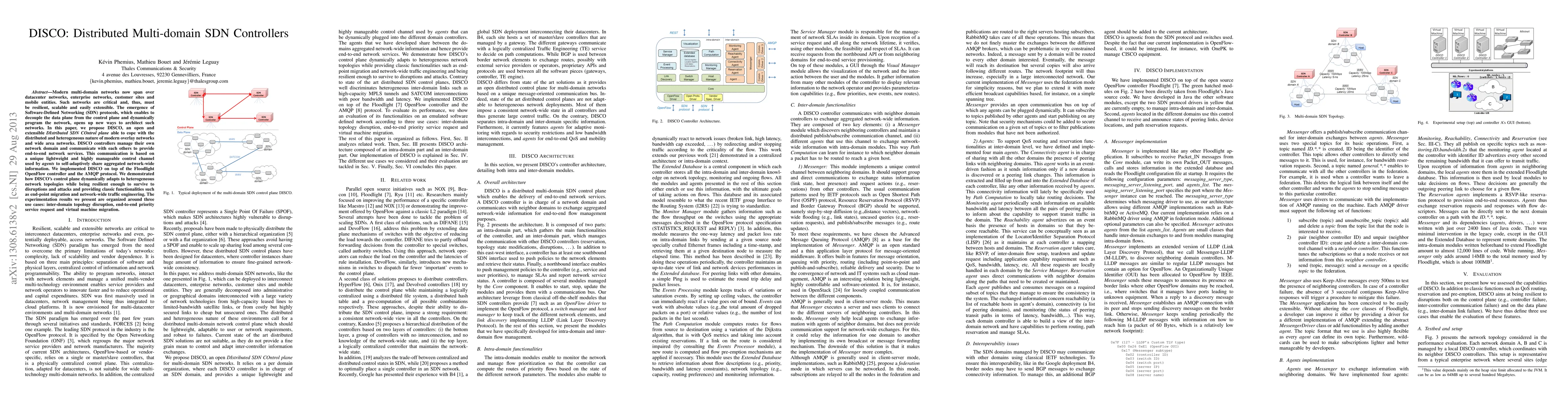 DISCO proposes a distributed and extensible SDN control plane to manage multi-domain networks, enabling resilience, scalability, and dynamic adaptation to heterogeneous topologies. Experiments demonstrate DISCO's ability to handle disruptions, prioritize services, and manage virtual machine migrations effectively.