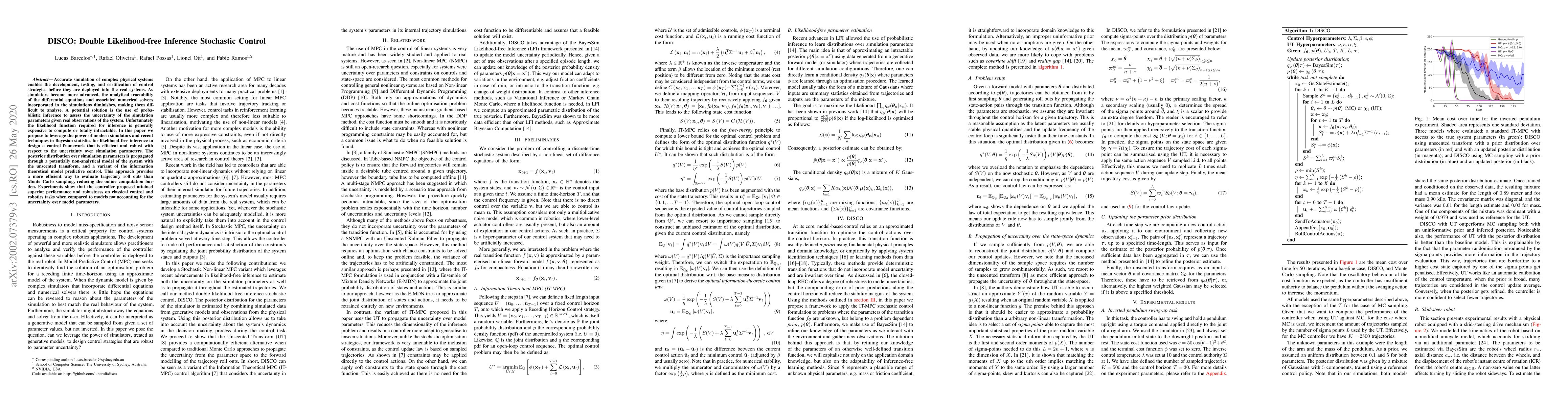 Accurate simulation of complex physical systems enables the development, testing, and certification of control strategies before they are deployed into the real systems. As simulators become more advanced, the analytical tractability of the differential equations and associated numerical solvers incorporated in the simulations diminishes, making them difficult to analyse. A potential solution is the use of probabilistic inference to assess the uncertainty of the simulation parameters given real observations of the system. Unfortunately the likelihood function required for inference is generally expensive to compute or totally intractable. In this paper we propose to leverage the power of modern simulators and recent techniques in Bayesian statistics for likelihood-free inference to design a control framework that is efficient and robust with respect to the uncertainty over simulation parameters. The posterior distribution over simulation parameters is propagated through a potentially non-analytical model of the system with the unscented transform, and a variant of the information theoretical model predictive control. This approach provides a more efficient way to evaluate trajectory roll outs than Monte Carlo sampling, reducing the online computation burden. Experiments show that the controller proposed attained superior performance and robustness on classical control and robotics tasks when compared to models not accounting for the uncertainty over model parameters.