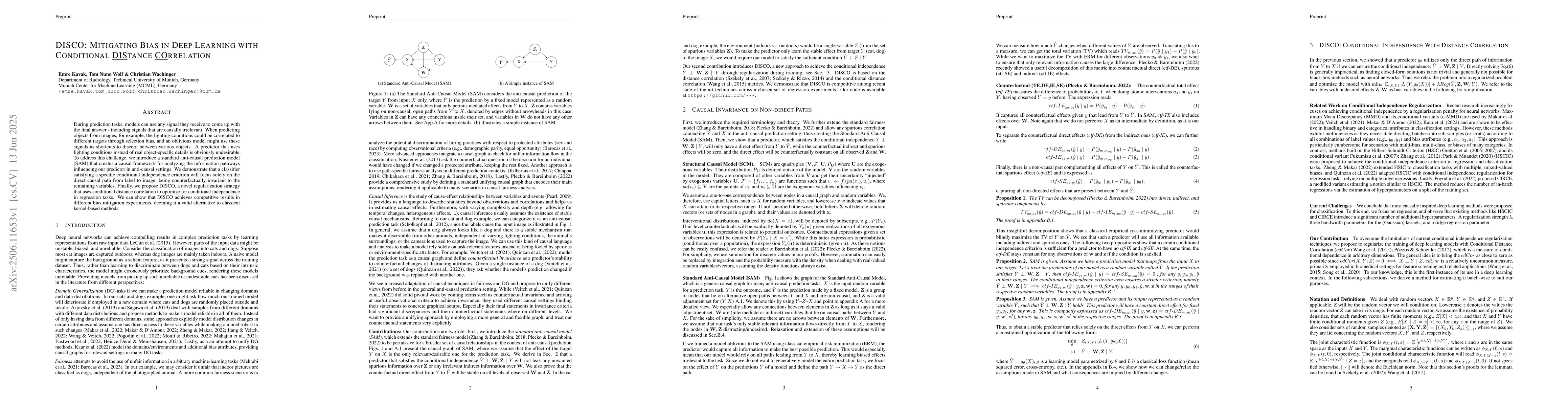 During prediction tasks, models can use any signal they receive to come up with the final answer - including signals that are causally irrelevant. When predicting objects from images, for example, the lighting conditions could be correlated to different targets through selection bias, and an oblivious model might use these signals as shortcuts to discern between various objects. A predictor that uses lighting conditions instead of real object-specific details is obviously undesirable. To address this challenge, we introduce a standard anti-causal prediction model (SAM) that creates a causal framework for analyzing the information pathways influencing our predictor in anti-causal settings. We demonstrate that a classifier satisfying a specific conditional independence criterion will focus solely on the direct causal path from label to image, being counterfactually invariant to the remaining variables. Finally, we propose DISCO, a novel regularization strategy that uses conditional distance correlation to optimize for conditional independence in regression tasks. We can show that DISCO achieves competitive results in different bias mitigation experiments, deeming it a valid alternative to classical kernel-based methods.