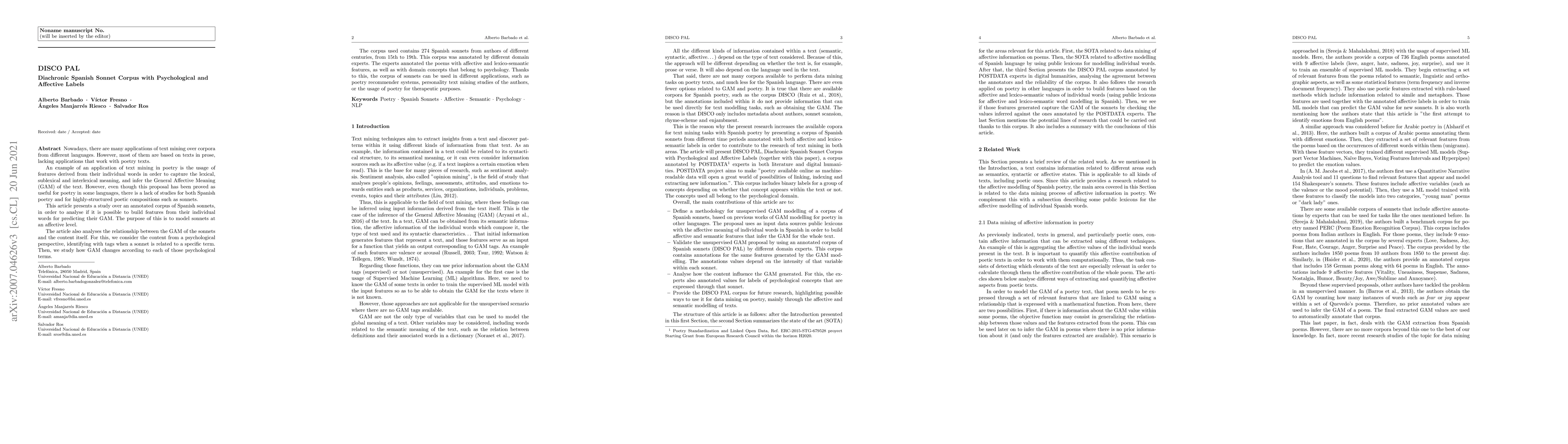 The DISCO PAL corpus provides annotated Spanish sonnets with psychological and affective labels, aiming to model sonnets at an affective level and explore the relationship between their General Affective Meaning and psychological content. This resource can support applications like poetry recommenders, author personality studies, and therapeutic uses of poetry.