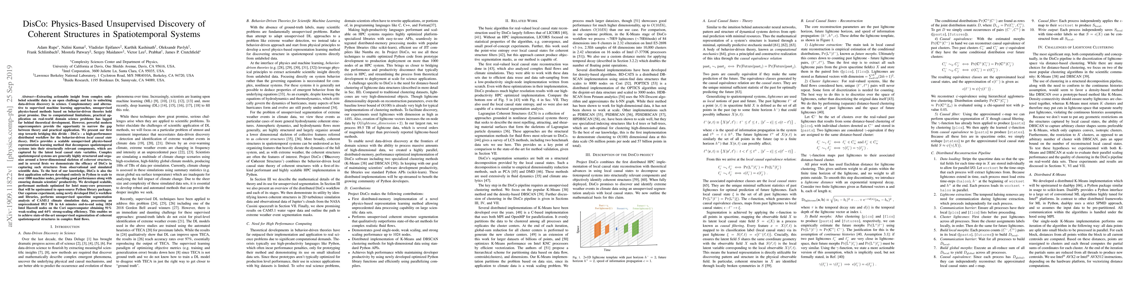 Extracting actionable insight from complex unlabeled scientific data is an open challenge and key to unlocking data-driven discovery in science. Complementary and alternative to supervised machine learning approaches, unsupervised physics-based methods based on behavior-driven theories hold great promise. Due to computational limitations, practical application on real-world domain science problems has lagged far behind theoretical development. We present our first step towards bridging this divide - DisCo - a high-performance distributed workflow for the behavior-driven local causal state theory. DisCo provides a scalable unsupervised physics-based representation learning method that decomposes spatiotemporal systems into their structurally relevant components, which are captured by the latent local causal state variables. Complex spatiotemporal systems are generally highly structured and organize around a lower-dimensional skeleton of coherent structures, and in several firsts we demonstrate the efficacy of DisCo in capturing such structures from observational and simulated scientific data. To the best of our knowledge, DisCo is also the first application software developed entirely in Python to scale to over 1000 machine nodes, providing good performance along with ensuring domain scientists' productivity. We developed scalable, performant methods optimized for Intel many-core processors that will be upstreamed to open-source Python library packages. Our capstone experiment, using newly developed DisCo workflow and libraries, performs unsupervised spacetime segmentation analysis of CAM5.1 climate simulation data, processing an unprecedented 89.5 TB in 6.6 minutes end-to-end using 1024 Intel Haswell nodes on the Cori supercomputer obtaining 91% weak-scaling and 64% strong-scaling efficiency.