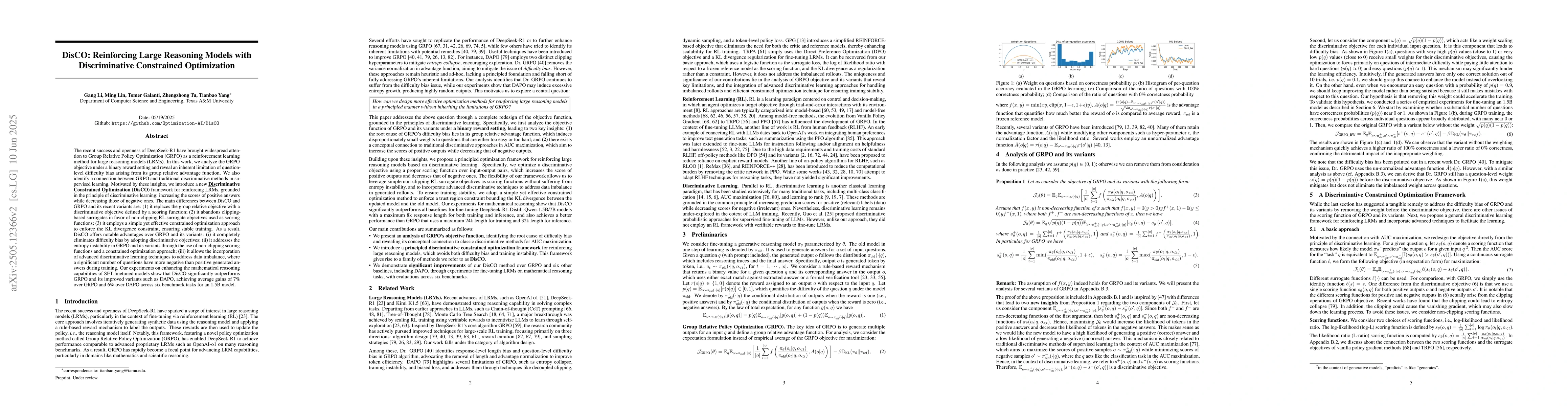 The paper analyzes GRPO under a binary reward setting, identifying its difficulty bias and connection to supervised learning. It introduces DisCO, a Discriminative Constrained Optimization framework for reinforcing LRMs, differing from GRPO by using discriminative objectives, non-clipping RL surrogate objectives, and constrained optimization for KL divergence.